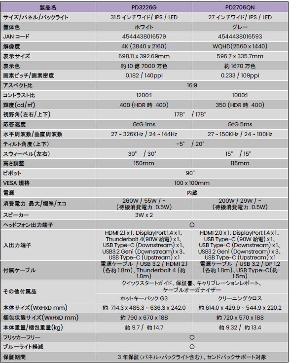 「PD3226G」はThunderbolt 4(90W給電)、「PD2706QN」はType-C(90W給電)対応で、ケーブル1本で給電もデータ転送も可能な接続性の高さも特長の製品となっています。