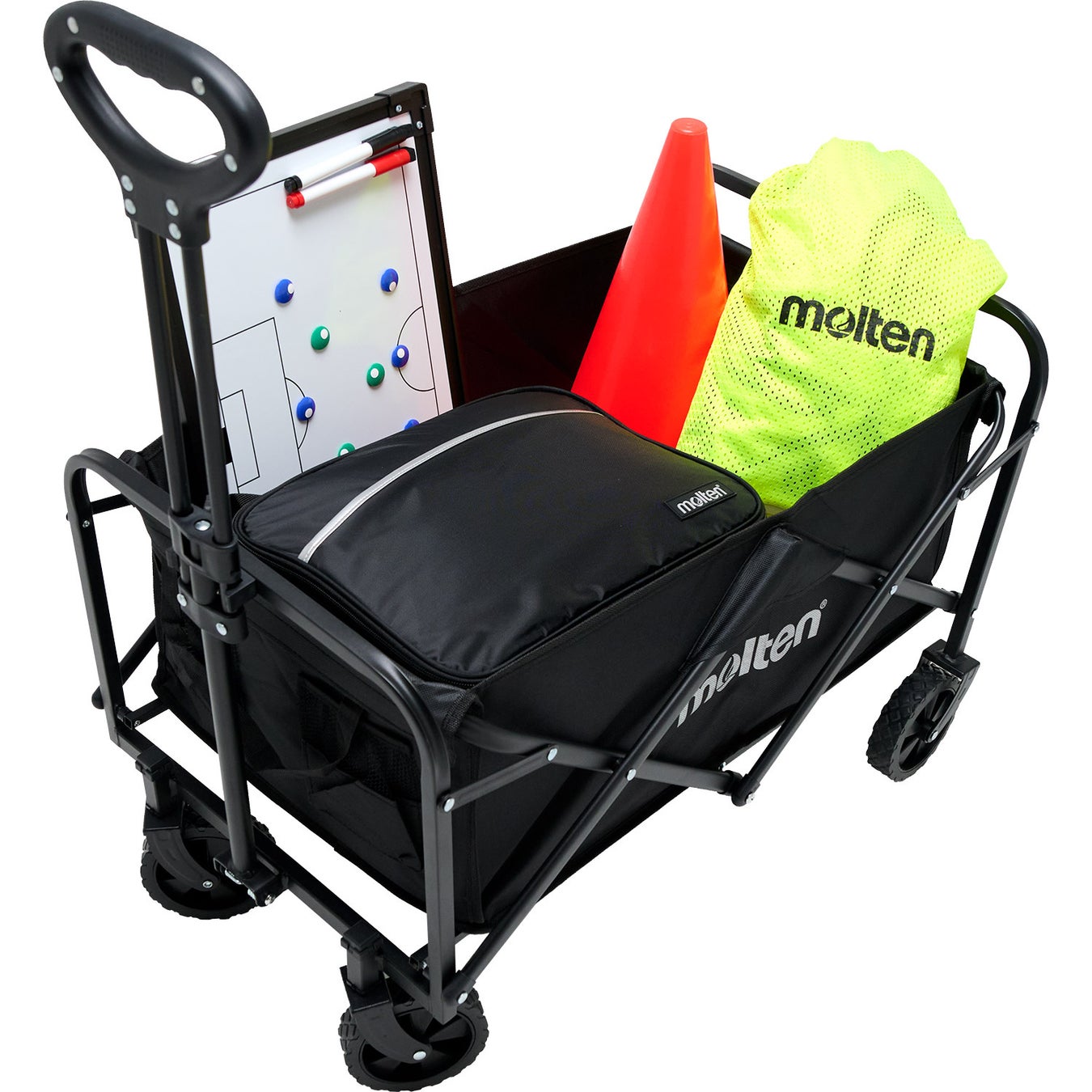 学校や部活動の現場では、作戦盤や練習用具、メディカルバッグ、クーラーボックスなど、多くの用具を限られた人数で運搬・管理する必要があります。モルテンの『アウトドアワゴン』は、静止時約80 kgの耐荷重設計により複数の用具をまとめて運べるほか、名入れに対応することで、学校名やチーム名を明示した管理・運用を可能にしました。日常的に使われるスポーツエキップメントとして、運搬のしやすさだけでなく、現場での扱いやすさにも配慮しています。
