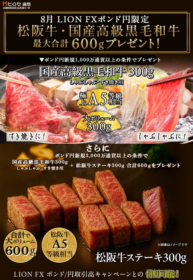 ヒロセ通商株式会社 (本社:大阪府西区、代表取締役:野市 裕作、以下:当社)は、当社の提供する「LION FX」において、2025年8月1日(金)より、「LION FXポンド円限定 松阪牛・国産高級黒毛和牛最大600gプレゼントキャンペーン」を実施することをお知らせいたします。