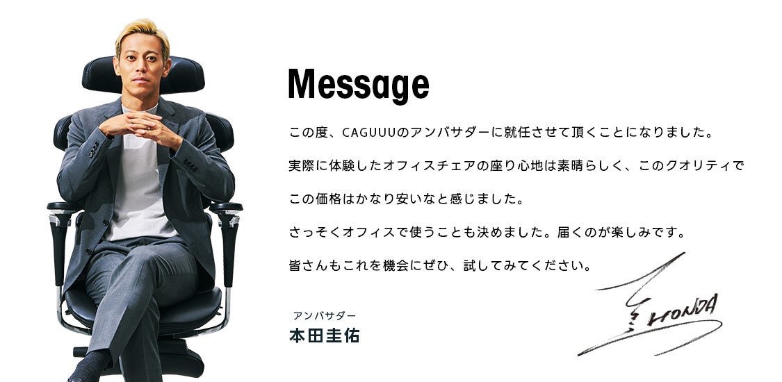 プロサッカー選手であり投資家でもある本田圭佑氏は、以前よりCAGUUUの理念と将来への挑戦に共感し出資しており、ブランドアンバサダーに就任いただくことになりました。今後は、本田氏とともに、家具を通じてより多くの人に快適で自由な暮らしの楽しさを伝えていきます。