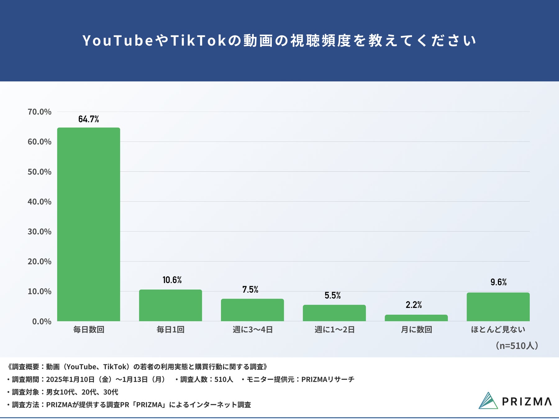 株式会社PRIZMA(https://www.prizma-link.com/press)は、10代~30代の男女510名を対象に、年代別の視聴頻度や視聴時間、人気のジャンル、さらにはこれらのプラットフォームが購買行動にどのような影響を与えているのかといった「動画(YouTube、TikTok)の若者の利用実態と購買行動に関する調査」を実施しました。