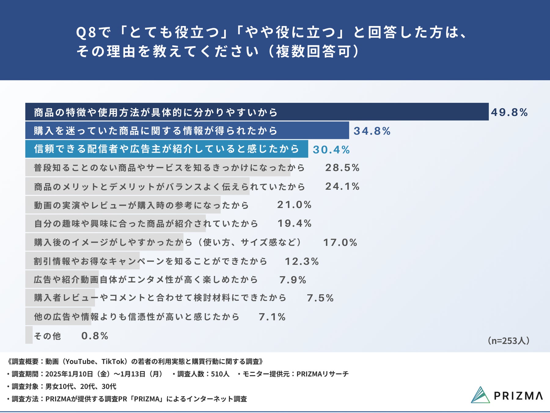 Q8で「とても役に立つ」「やや役に立つ」と回答した方に、「Q9. その理由を教えてください」と質問したところ、最も多かったのは『商品の特徴や使用方法が具体的に分かりやすいから(49.8%)』で、次いで『購入を迷っていた商品に関する情報が得られたから(34.8%)』『信頼できる配信者や広告主が紹介していると感じたから(30.4%)』が続きました。