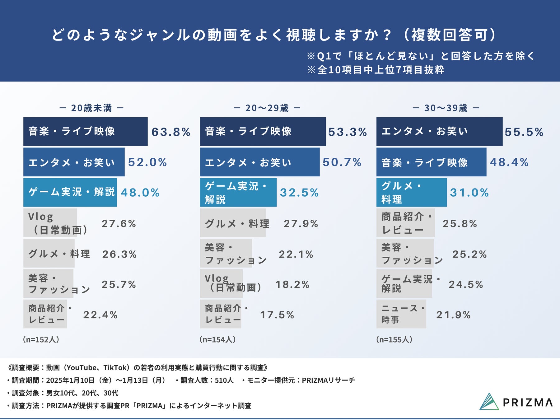 20歳未満では、『音楽・ライブ映像(63.8%)』が最も多く、『エンタメ・お笑い(52.0%)』『ゲーム実況・解説(48.0%)』『Vlog(日常動画)(27.6%)』が続きました。