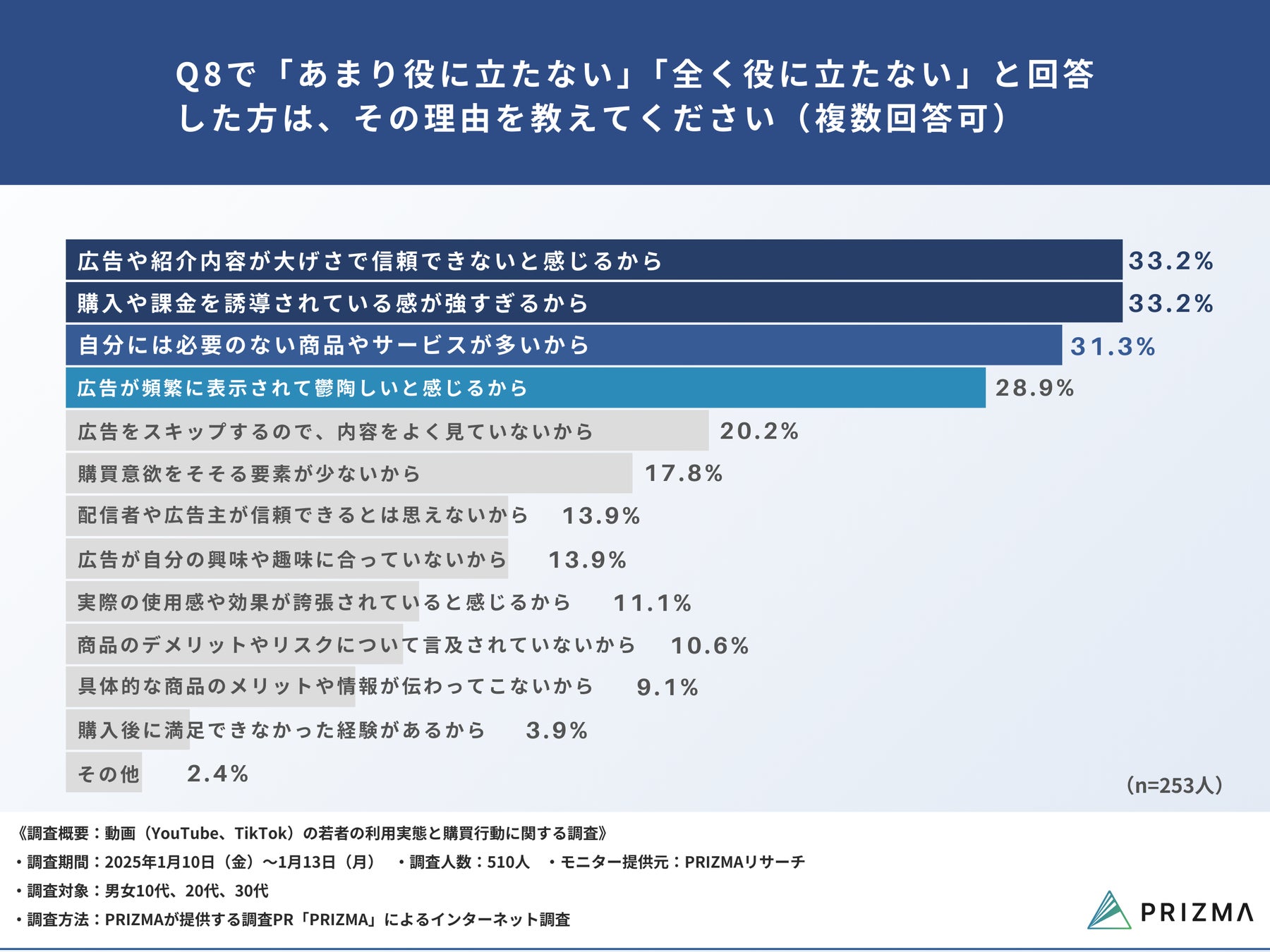 一方で、Q8で「あまり役に立たない」「全く役に立たない」と回答した方に、「Q10. その理由を教えてください」と質問したところ、最も多かったのは、『広告や紹介内容が大げさで信頼できないと感じるから(33.2%)』と『購入や課金を誘導されている感が強すぎるから(33.2%)』でした。次いで、『自分には必要のない商品やサービスが多いから(31.3%)』『広告が頻繁に表示されて鬱陶しいと感じるから(28.9%)』が続きました。