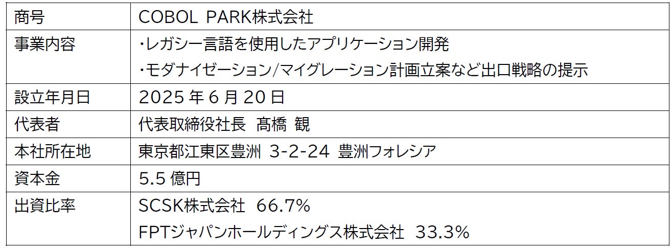 SCSK株式会社(本社:東京都江東区、代表取締役 執行役員 社長:當麻 隆昭、以下 SCSK)とFPTジャパンホールディングス株式会社(本社:東京都港区、代表取締役社長:ド・ヴァン・カック(Do Van Khac)、以下 FPT)は、主にメインフレームを利用している企業を対象に、ビジネス継続に向けた既存レガシーシステム※1の維持・改善やモダン化に向けた道筋の提示など、出口戦略の提供を事業の柱とする新会社「COBOL PARK株式会社(以下COBOL PARK)」を設立し、事業を開始しました。個別最適化されたレガシーシステムの全体最適化を促進し、お客様が経営資源を戦略的に再配分できる環境を整えることで、DX(デジタルトランスフォーメーション)の推進および競争力の強化に貢献します。