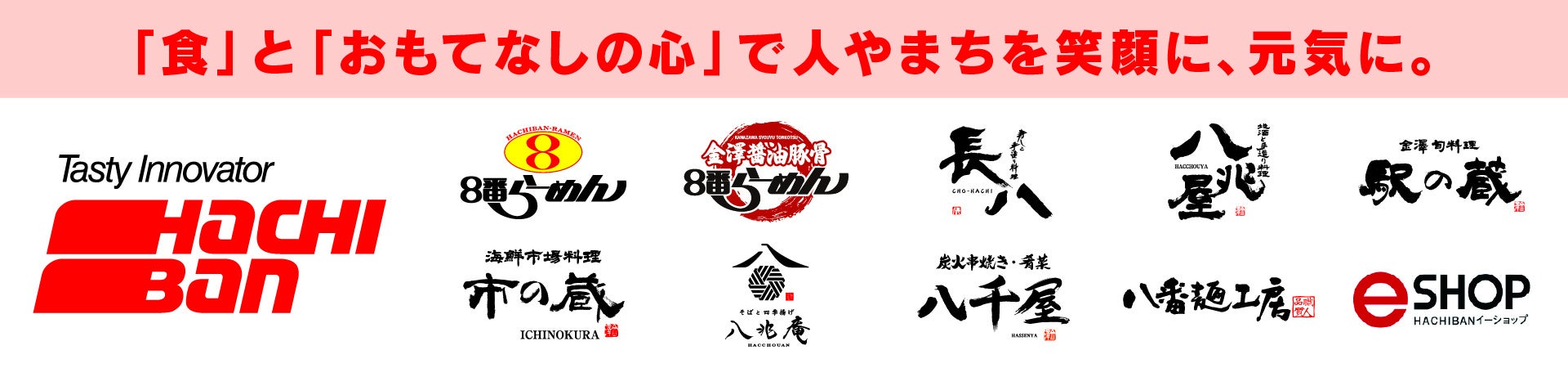 1967年2月11日に「8番ラーメン」を創業、同年9月にはフランチャイズ展開を開始(1971年1月21日に当社を設立)。1977年10月には、ファミリー層を対象に屋号を「8番ラーメン」から「8番らーめん」に変更。現在「8番らーめん」は、北陸を中心に国内114店舗、海外はタイ・ベトナムに178店舗を展開(2026年3月20日現在)。その他にも、和風居酒屋「八兆屋」「長八」「市の蔵」や、そばと四季揚げ「八兆庵」、炭火串焼き・肴菜「八千屋」など、日常からハレの日のお食事まで、複数のブランドを通じて多くのお客様にハチバンのおいしさをお届けできるよう、さまざまな挑戦を続けています。これからも、私たちハチバングループは、「『食』と『おもてなしの心』で人やまちを笑顔に、元気に。」という経営の目指す姿のもと、地域社会やお客様をはじめ、すべてのステークホルダーの皆さまの「幸福な生活」を実現できるよう誠心誠意努め、「食はハチバン」と、日本はもとより、海外においても愛され続ける企業を目指して、努力を続けてまいります。