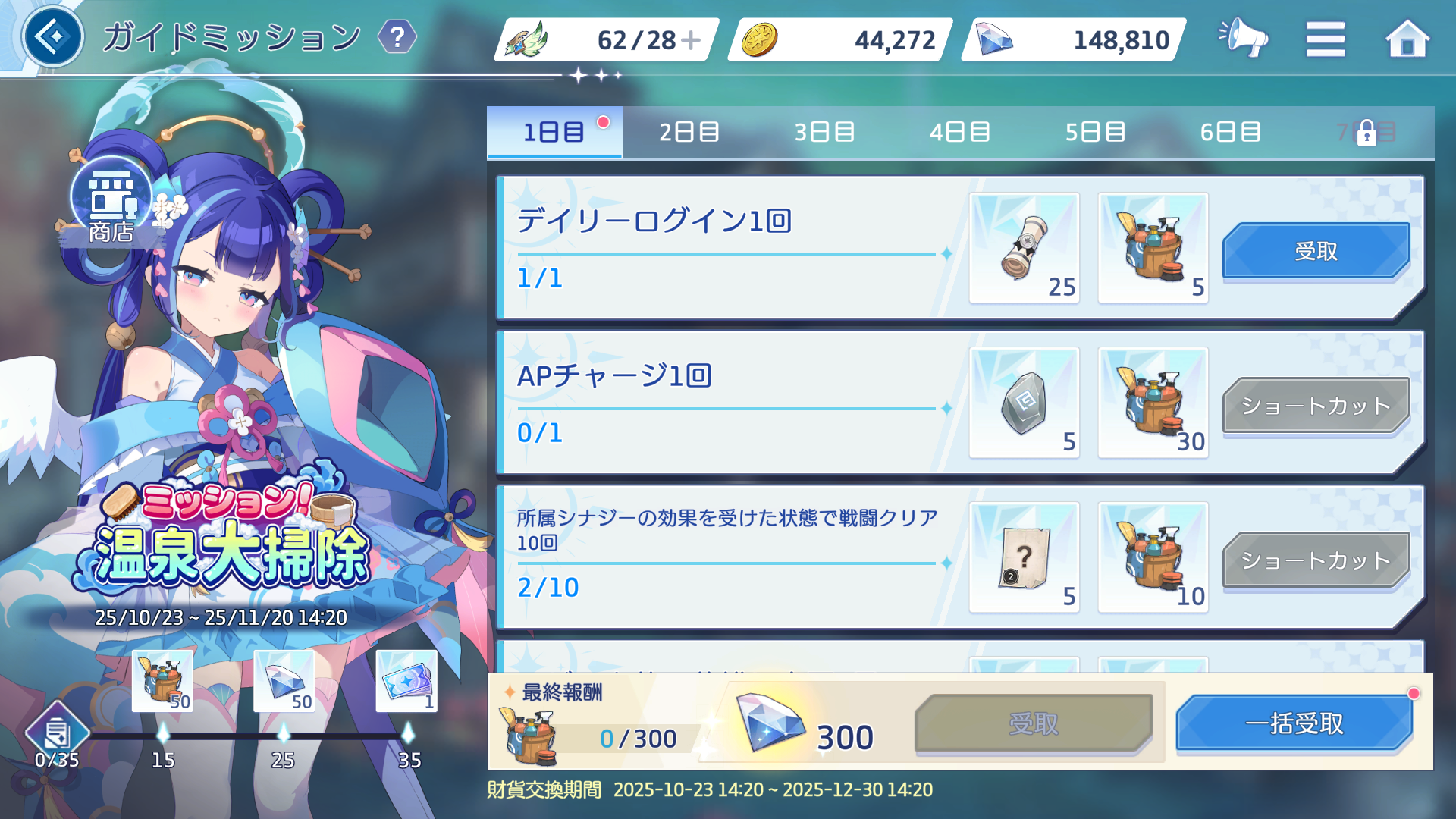 用意したミッションをクリアすることで様々な報酬が手に入るほか、集めた「温泉用掃除道具」を使い、専用商店でアイテムを購入することもできます。