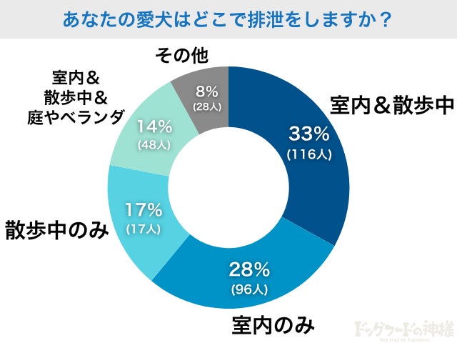 愛犬の排泄場所については、「室内と散歩の併用」が33%で最も多く、次いで「室内のみ」が28%という結果になりました。