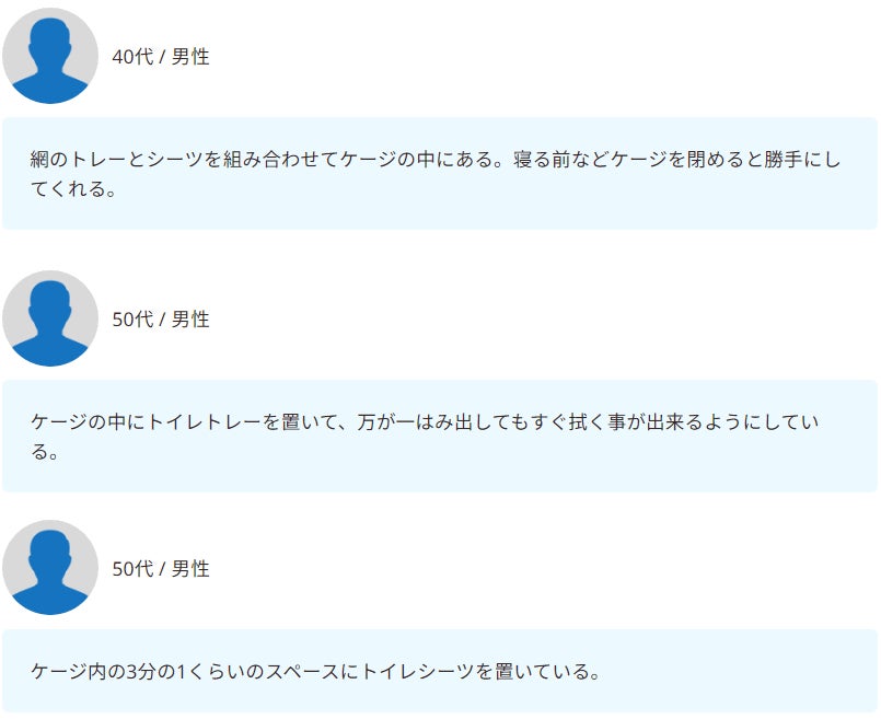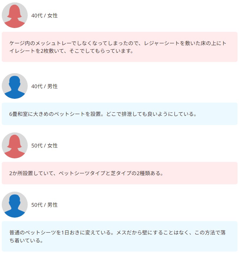「ケージ内にトイレトレーやシーツを配置し、排泄場所をはっきり分けている」という声もいくつか寄せられました。