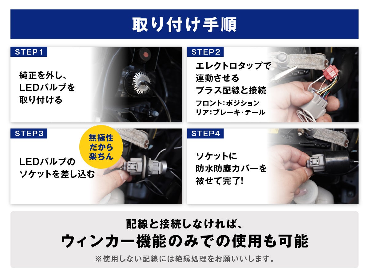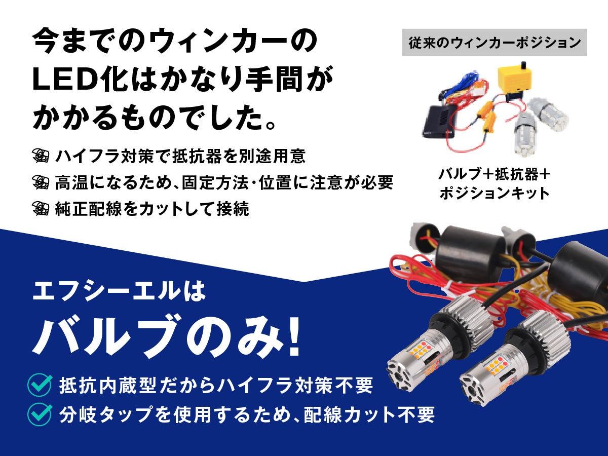 抵抗内蔵型: ハイフラッシュ(高速点滅)対策の抵抗がバルブ本体に内蔵されているため、別途抵抗器を用意したり、複雑な配線作業を行ったりする必要がありません。バルブを交換するだけで、ウィンカーポジション機能が実現します。
