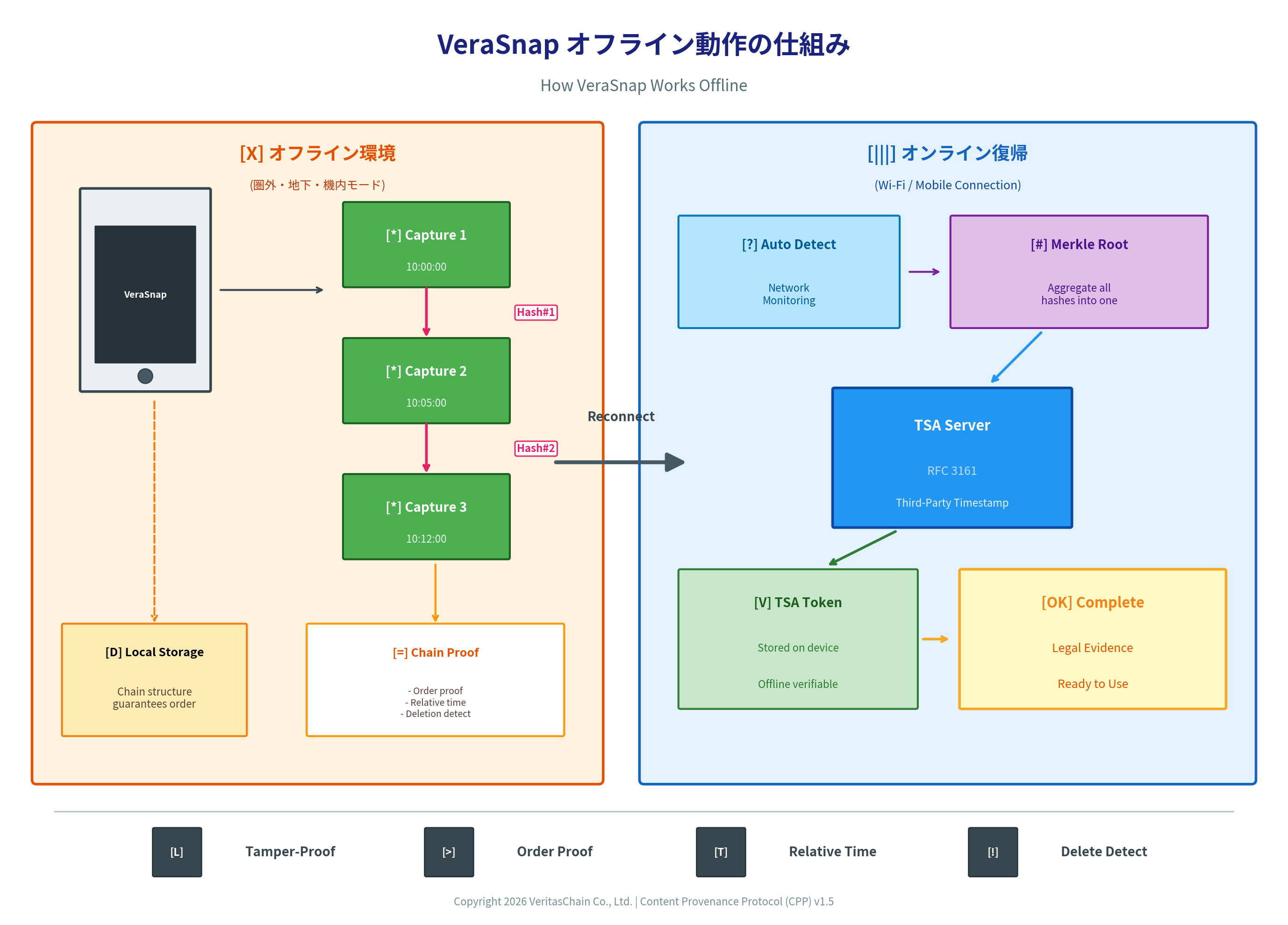 建設現場の地下、山間部の災害現場、通信障害発生時など、ネットワーク接続が困難な状況でも、VeraSnapは撮影の時間的順序と相対時間間隔を暗号学的に証明します。独自のチェーン構造により、オフライン中の複数撮影がハッシュ値で連結され、撮影順序の改ざんや中間データの削除が検出可能になります。