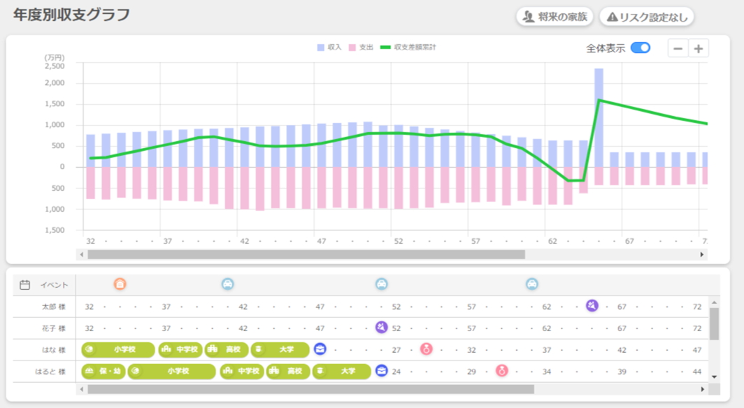 お客さまの人生設計とリスクシミュレーションを同時に行う、プルデンシャル生命のオリジナルツールです(特許第7146966号)。将来のライフイベントや、世帯の収支バランス、備えた保障と備えていない保障を表やグラフで分かりやすくご覧いただくことができます。