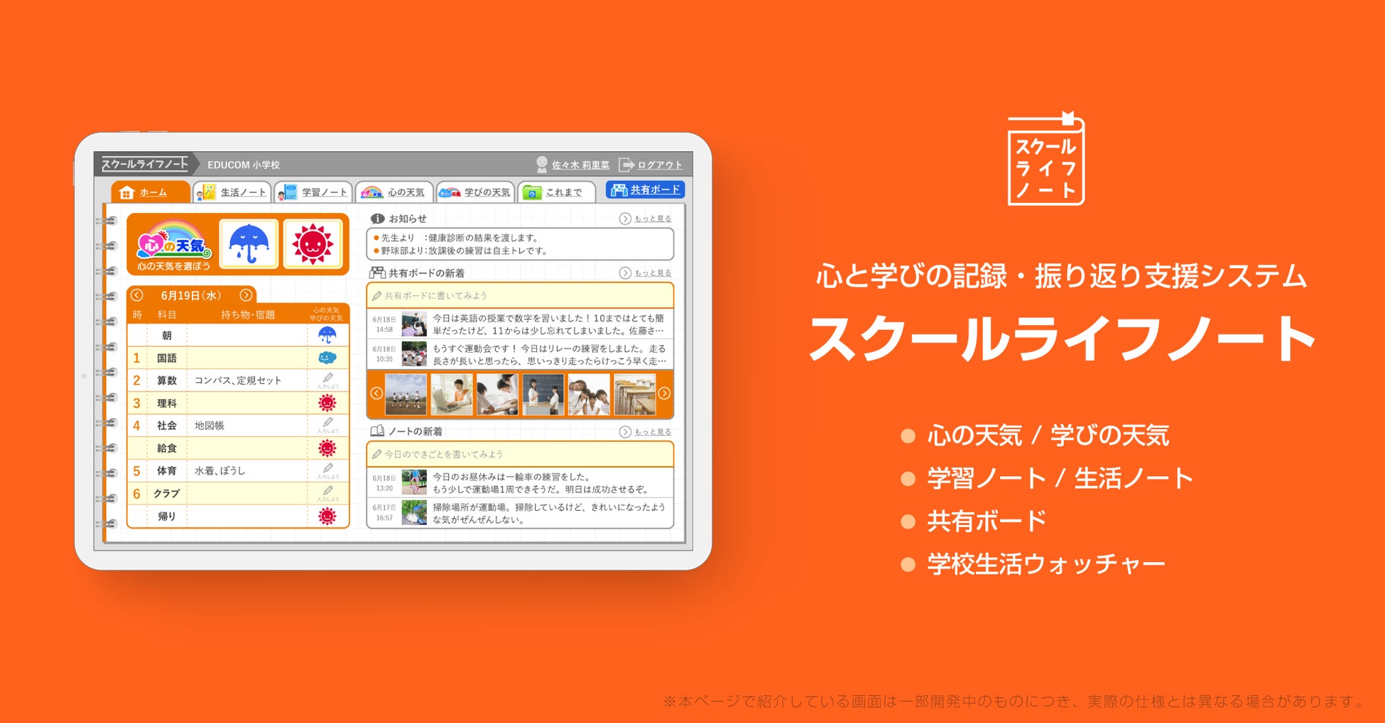 「スクールライフノート」は、児童生徒の日々の気持ちを天気に例えて可視化する「心の天気」と、授業ごとに児童生徒が自らの学びを天気と文章で振り返る「学びの天気」の機能を備えた、心と学びの記録・振り返りを支援するシステムです。子どもたちは、振り返りにより自己を客観視する力や気持ちや学習を自らの状態・状況に合わせて調整する力(非認知スキル)を向上させ、「学びに向かう力」を育みます。先生方は、子どもたちが記録した、「気持ち」の変化や揺れをクラスで俯瞰したり、個人の記録をクローズアップして確認することで、適切なタイミングでの「声掛け」や「支援」ができるようになります。