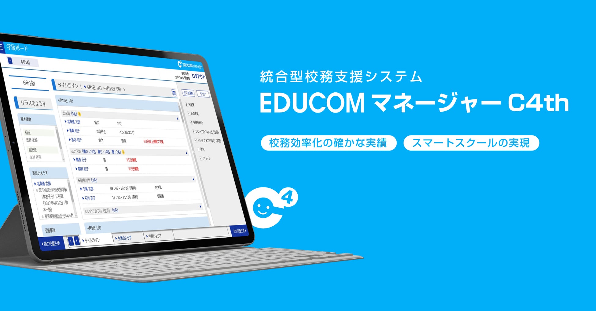 「EDUCOMマネージャーC4th」は、EDUCOMがクラウドあるいはオンプレミスで提供する、全国の小中学校向けに先生の校務の効率化を支援する統合型校務支援システムです。学籍管理、成績管理、グループウェア、校務管理、保健管理などの機能を統合的に有しています。きめ細やかなサポートにご好評いただき、全国約500自治体、約10,000の小中学校で利用され、シェアNo.1を誇ります。