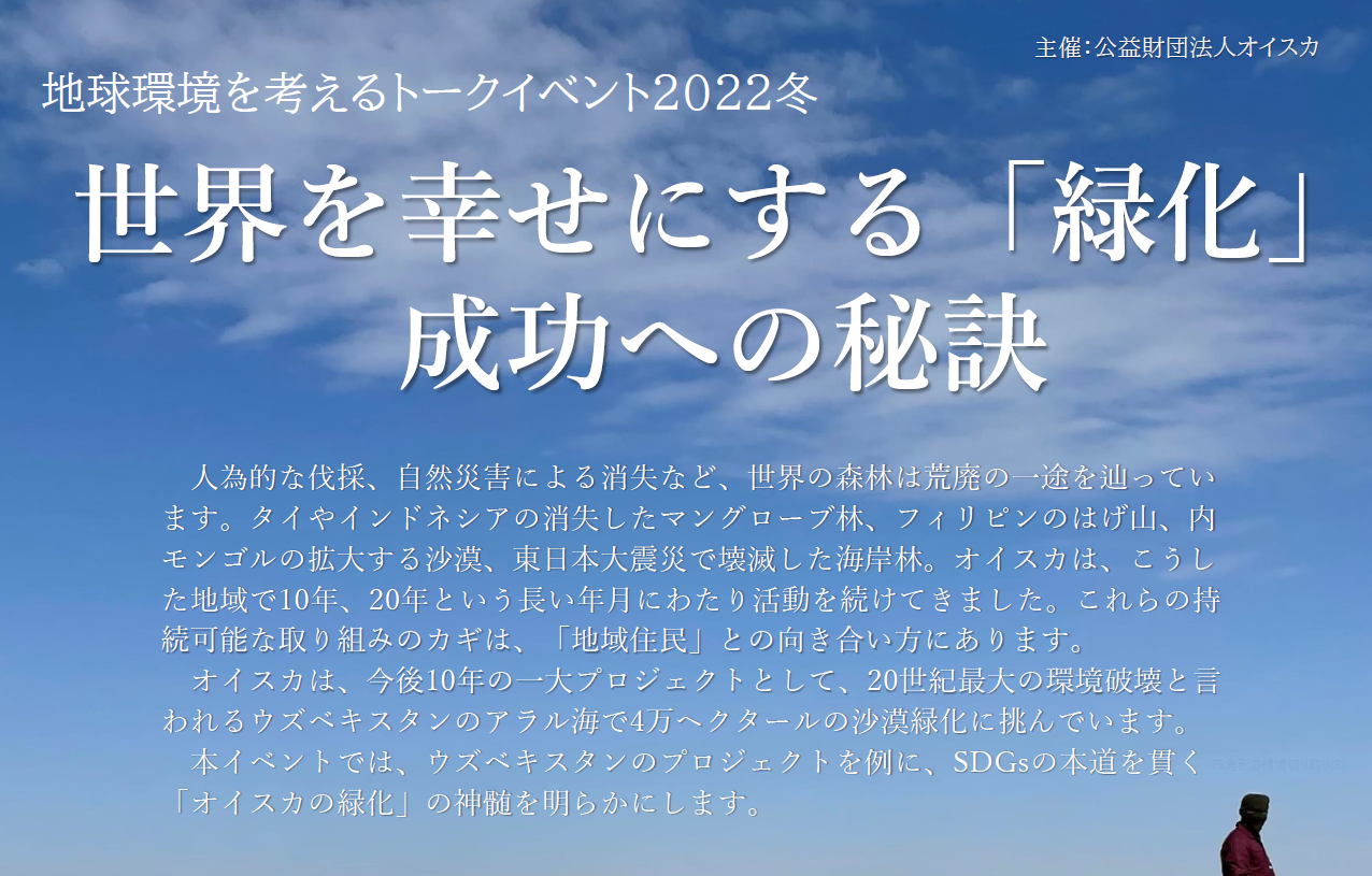 本イベントでは、太田猛彦氏(東京大学名誉教授/さいたま緑のトラスト協会理事長)、冨樫智氏(OISCA college LTD./沙漠化防止事業専門家)、長宏行(オイスカスタッフ/海外事業部)が登壇。アラル海での沙漠緑化事業にクローズアップし、これまでオイスカが実践してきた住民と共に取り組む緑化についてトークイベントを開催します。