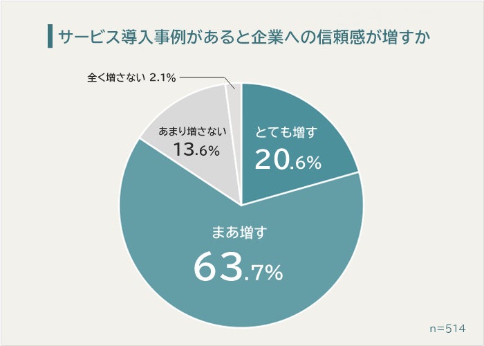 「サービス導入事例やお客様の声があると、企業やサービスに対する信頼感が増すか」という問いには、84.3%が「増す」と回答。導入事例やお客様の声が、顧客からの信頼獲得に寄与していることがわかります。