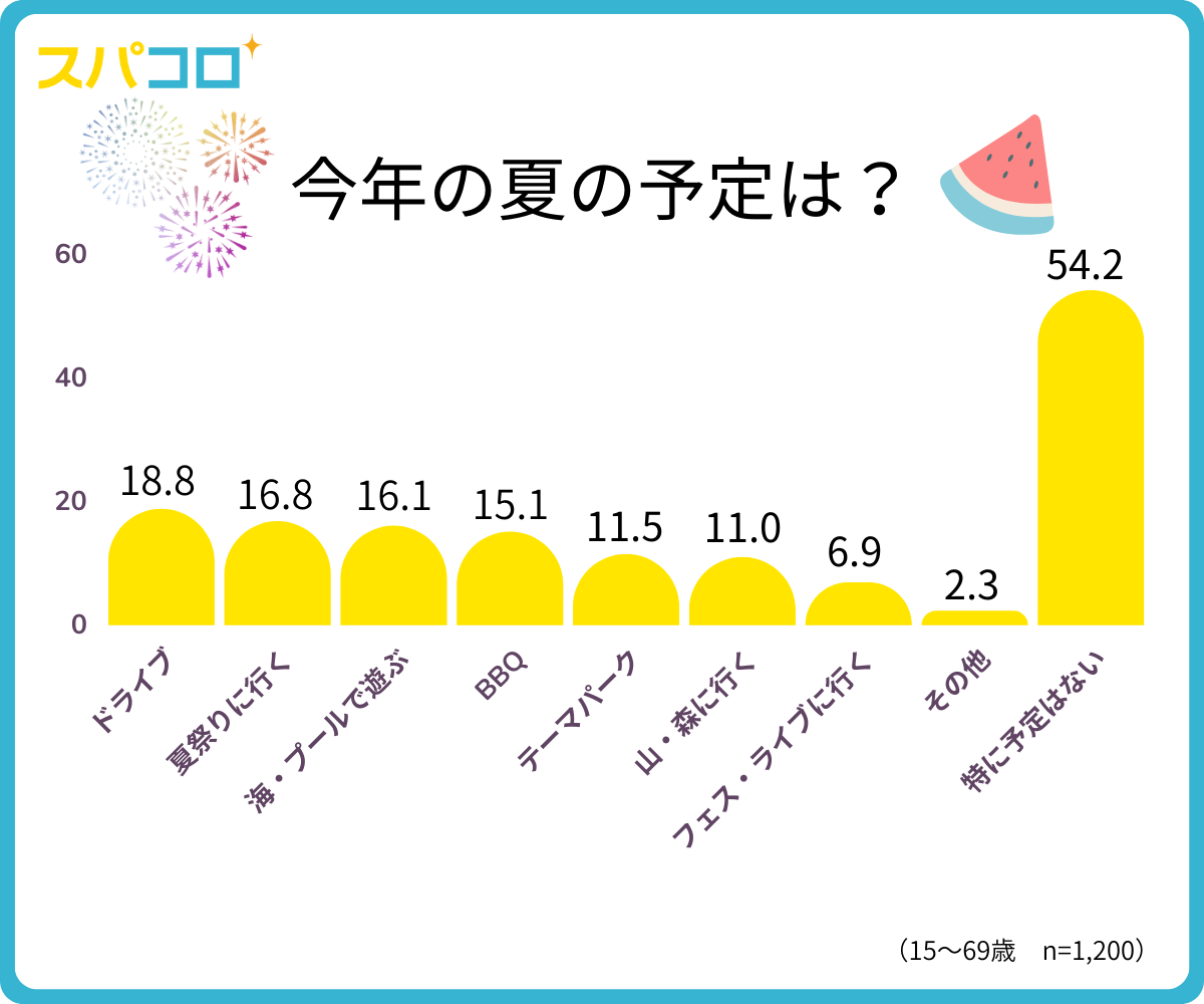 今年の夏の予定は「ドライブ」(18.8%)、「夏祭りに行く」(16.8%)、「海・プールで遊ぶ」(16.1%)、「BBQ」(15.1%)。