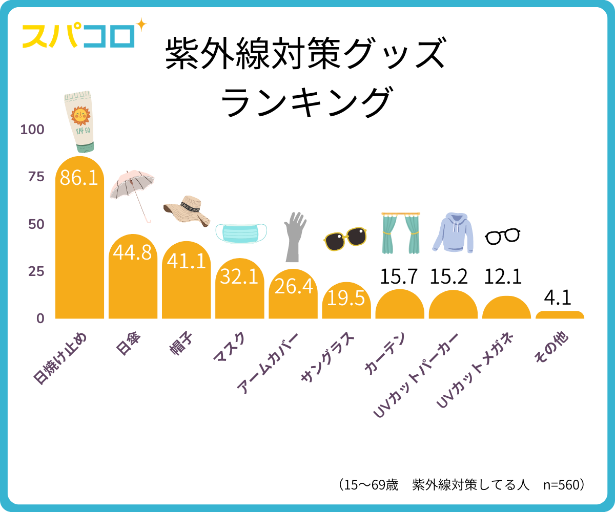 紫外線対策に使っているグッズは「日焼け止め」(86.1%)、「日傘」(44.8%)、「帽子」(41.1%)、「マスク」(32.1%)。