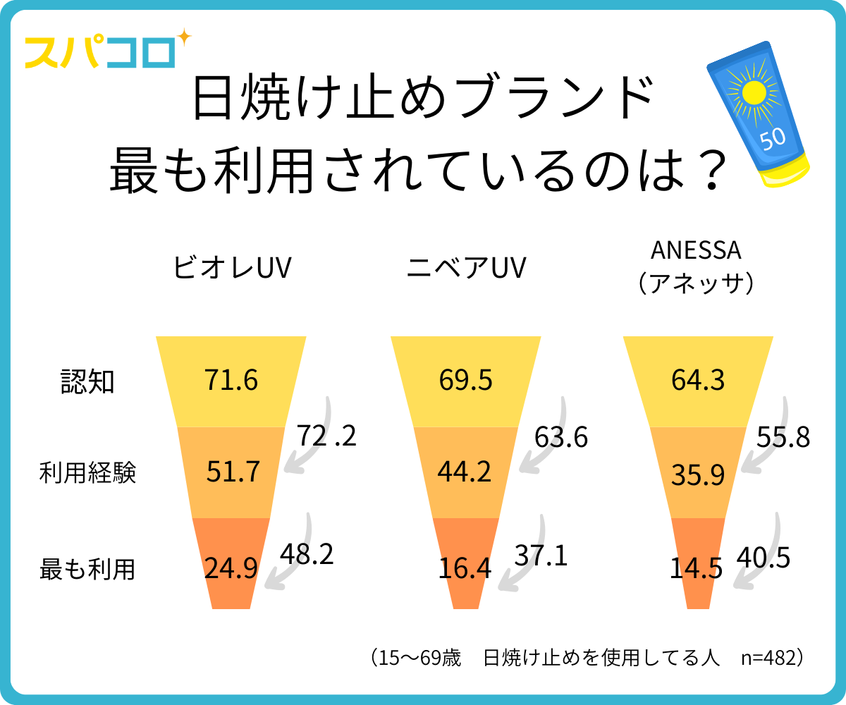 認知から最も利用するに至るまでのいずれの過程でも1位は「ビオレUV」となっており、各過程での離脱が少ないことがわかりました。また「ニベアUV」と「ANESSA(アネッサ)」を比較すると、最も利用している人の割合は「ニベアUV」(16.4%)と「ANESSA(アネッサ)」(14.5%)で「ニベアUV」の方が約2ポイント高いが、利用経験のある人が最も利用するまでに至る割合では「ニベアUV」は37.1%、「ANESSA(アネッサ)」は40.5%となり、「ANESSA(アネッサ)」の方が利用後に使い続ける人の割合が大きいことがわかります。