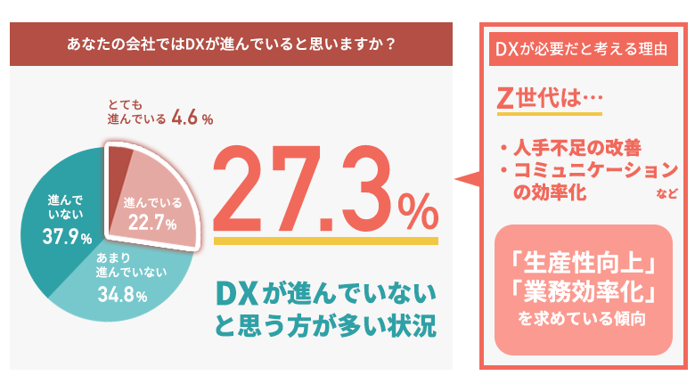 今回の調査では、人手不足が叫ばれている中、解決策の一つの糸口になると考えられる「DX」についても調査を実施した。所属する会社でDXが進んでいると思うかと尋ねたところ、『DX が進んでいる』と評価したのは全体の27.3%という結果に。中でもZ世代は48.4%が『DXが進んでいる』と評価しており、若年層が所属する企業・組織の方がDXは進んでいる傾向にあると考えられる。