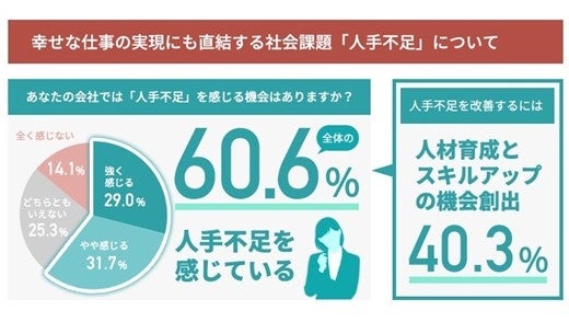 昨今、「少子高齢化に伴う労働人口の減少」や「地方の過疎化」により、どうしても人手不足を改善できないケースも多いと考えられるが、人材不足が及ぼす問題に対して、「人材の育成・スキルアップの機会創出」を改善策として必要となると考えている働き手の存在が明らかになった。