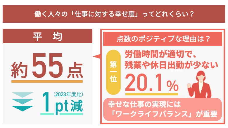 今回の<幸せな仕事に関する実態調査>から、2024年度の「仕事に対する幸せ度」の平均は約55点であることが分かった。2022年度から5ポイント減少したため、「仕事に対する幸せ度」が年々減少している状況にある。
