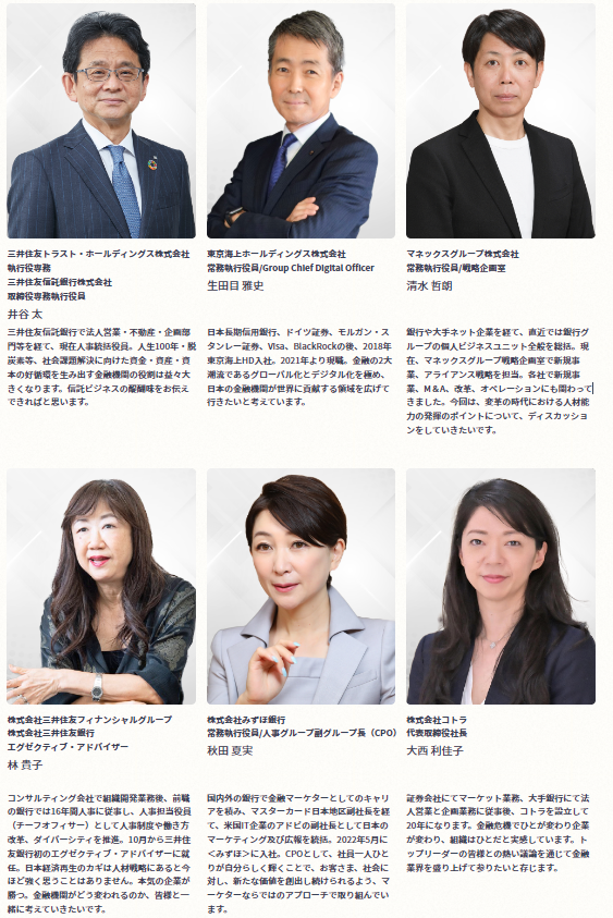 講演の第1部は、大手金融機関の人材活用・採用のキーパーソン3名が登壇する、“人的資本経営元年の振り返りとリーダーシップ”。金融業界での人的資本経営をどう評価し、どのように未来に向けてリーダーシップを発揮していくべきなのかを、金融界トップリーダーたちが対談形式で斬り込みます。