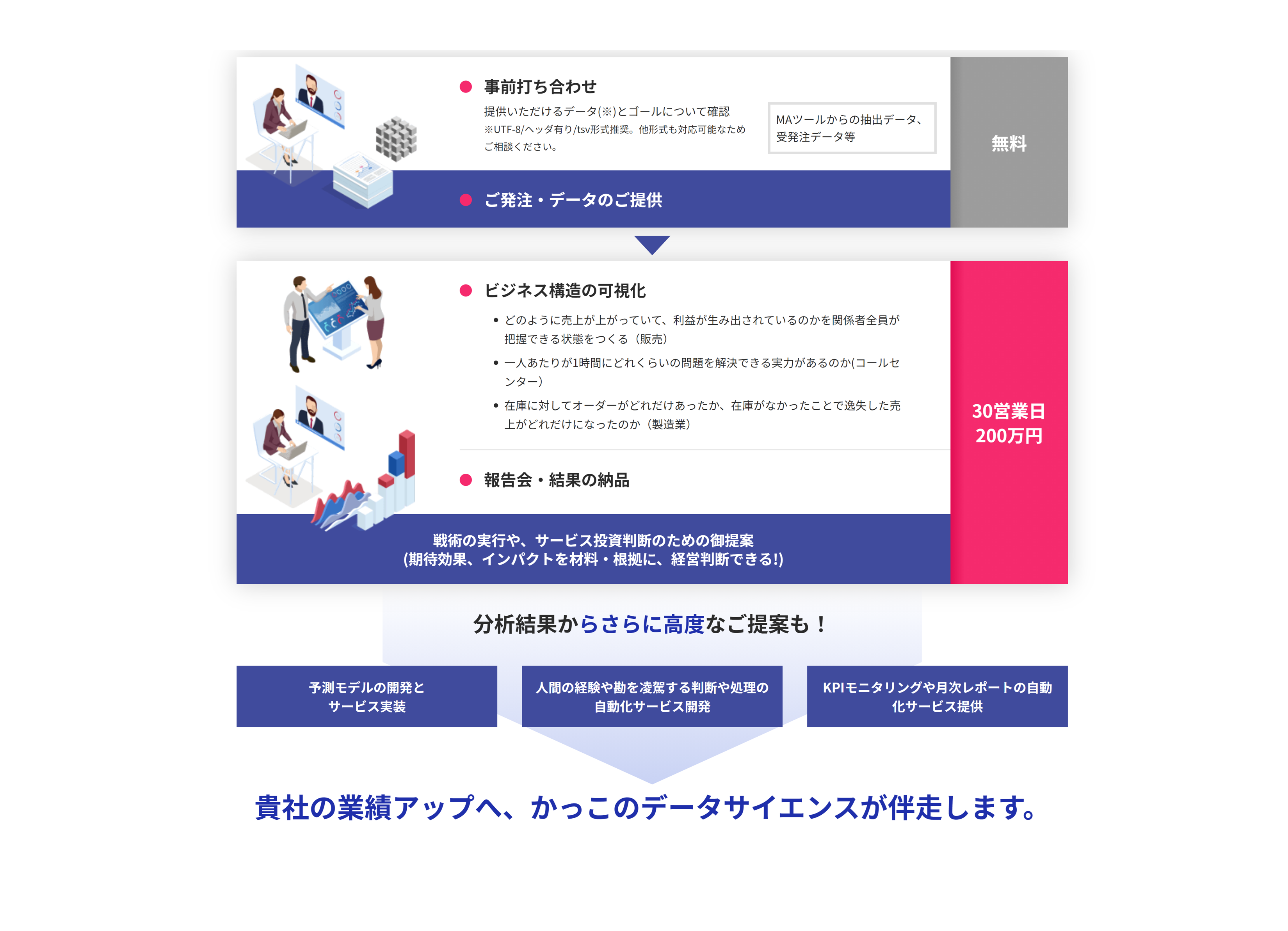 さらに打ち手となる戦術や、投資判断のための御提案までを、1億レコードまでのデータであれば、データ提供を受けてから30営業日、200万円で実施いたします。
