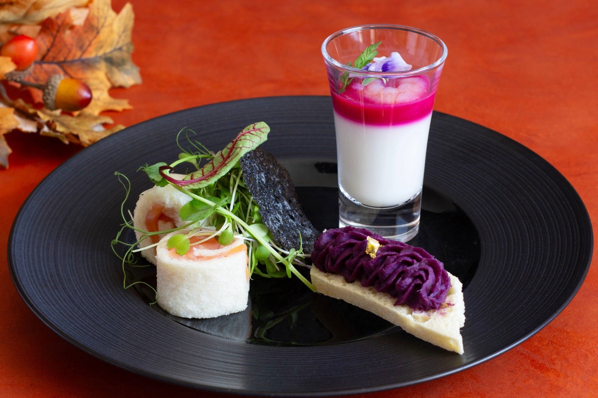 セイボリーには、紫色が印象的なビーツとカリフラワーのヴェリーヌ、フォアグラとトリュフの香りまとう紫芋のタルティーヌなど、秋の実りを組み合わせ豊かな味わいに仕立てました。