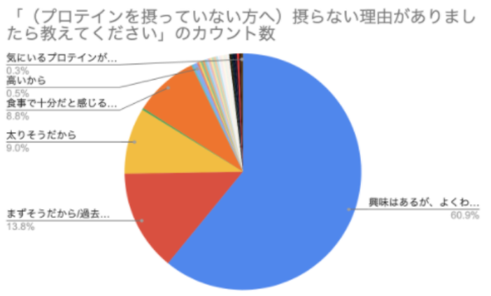 発売前に自社で行ったアンケート調査では、日頃プロテイン商品を摂っていない方の60.9%が「興味はあるが、よくわからない」と回答していました。また、次いで「まずそうだから/過去に飲んだ商品がまずかったから」という味に対する嫌悪感を持っている方が13.8%と2番目に多いこともわかりました。