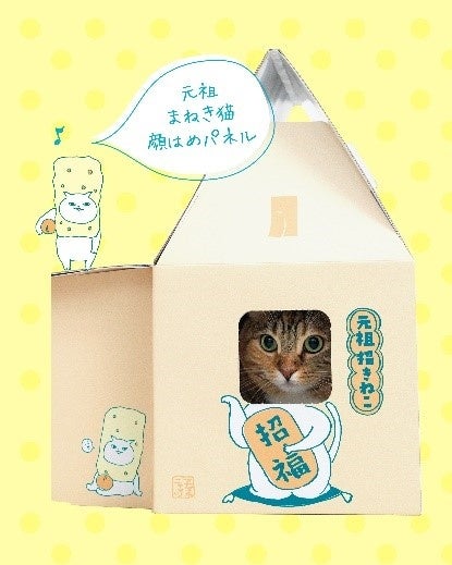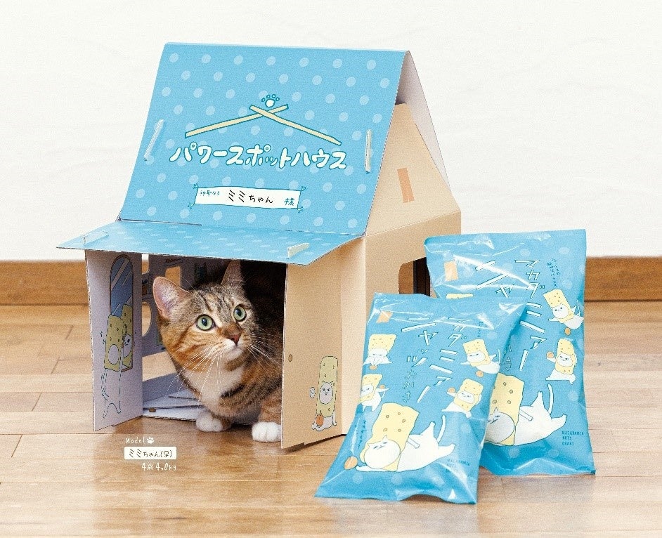 『マカダミアニャッツBOX』の空き箱を組み立てるとニャンコのおうちとして活用できます。昨年に比べて入口もおうちの中も大きくしたので、6㎏級のニャンコもゆったりとくつろげます。「まねき猫」になれる「顔はめパネル」でキュン、窓からひょっこり飛び出す顔やお尻にキュン。『マカダミアニャッツBOX』で楽しむニャンコを愛でながら、「マカダミアナッツおかき」を食べれば、おなかもこころも満たされること間違いなしです。