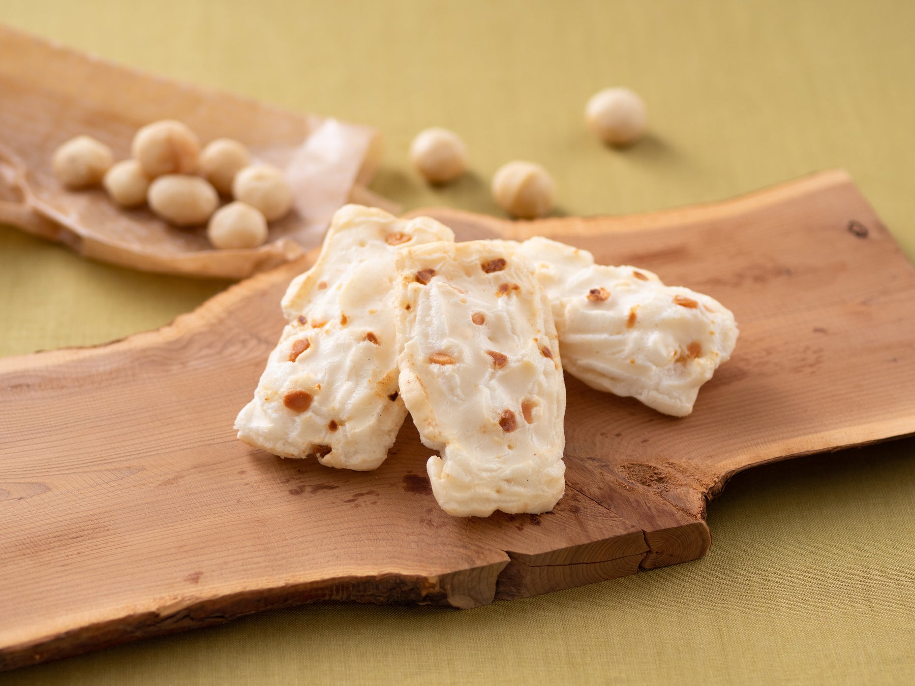 ふっくら柔らかく、サクサクとした食感にするために、丸粒の国産もち米ともち粉という2種類の原料から別々にもち生地を作っています。精米してすぐにもち生地に加工することで、もち米本来の香りが楽しめるます。さらに、生のマカダミアナッツを練りこむことで、マカダミアナッツのほのかな甘みとコクのある香ばしさを楽しんでいただけます。あっさりした塩味は飽きのこない美味しさで、一度食べるとおハマりになる方多数の商品です。