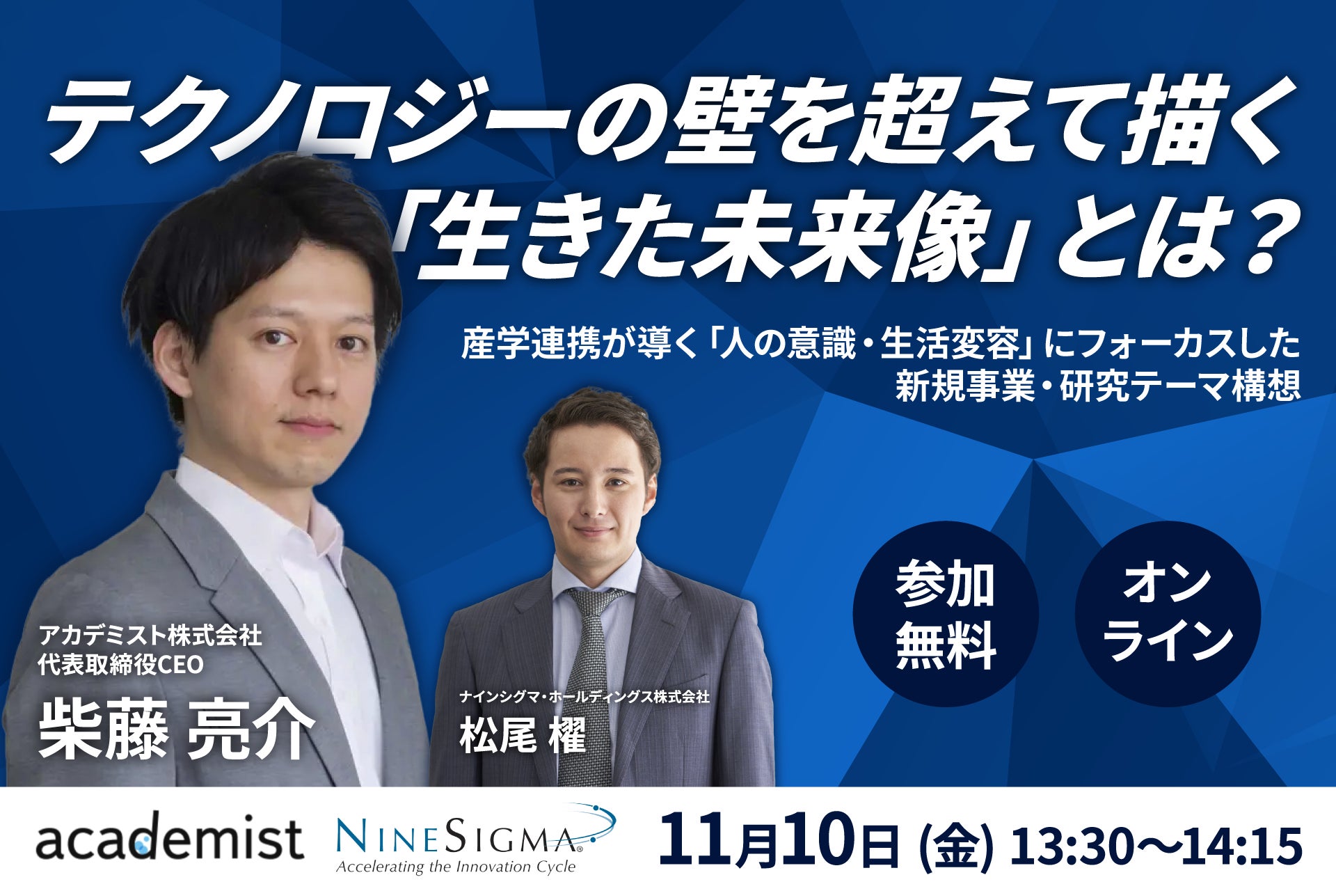 ナインシグマ・ホールディングス株式会社(本社:東京都千代田区、代表取締役社長:諏訪 暁彦、以下「ナインシグマ」)は、「外部知見・技術」の活用で事業・研究開発を推進する「オープンイノベーション」について、世界850社以上・国内280社以上の顧客に向け、その推進支援を行なっています。この度、大学研究者のコミュニティ活性化に実績のあるアカデミスト株式会社様(本社:東京都新宿区、代表者:柴藤 亮介、以下「アカデミスト様」)をお招きし、「テクノロジーの壁を超えて描く“生きた未来像”とは? 産学連携が導く“人の意識・生活変容”にフォーカスした新規事業・研究テーマ構想」と題した無料オンラインセミナーを開催いたします。本セミナーでは、新規事業・研究テーマ探索において生じやすい問題提起をはじめとして、アカデミスト様とナインシグマによる未来像の描き方やコラボレーションに関してのディスカッションを行います。本日より参加登録を開始いたしますのでお知らせします。