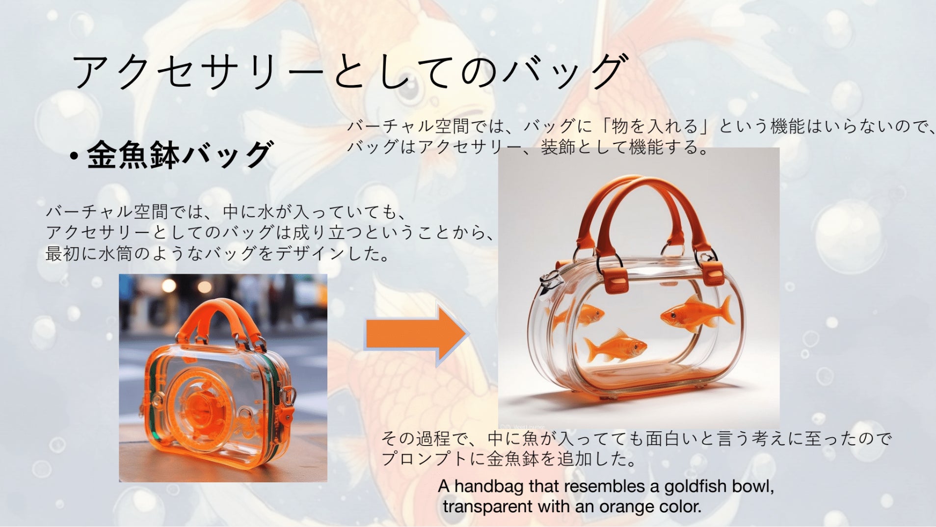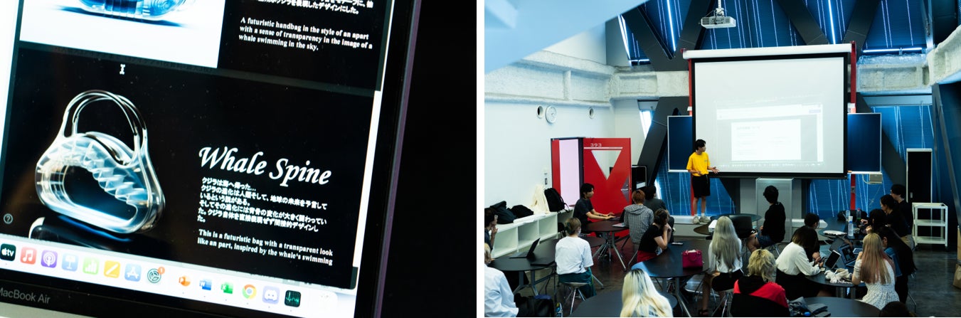 上田が登壇した2回目の授業では、前回出したファッションブランド「accelerando.ai」のコンセプトに沿ったバッグを創って欲しい、というお題に沿って、自分で生成した作品を学生にプレゼンしてもらいました。