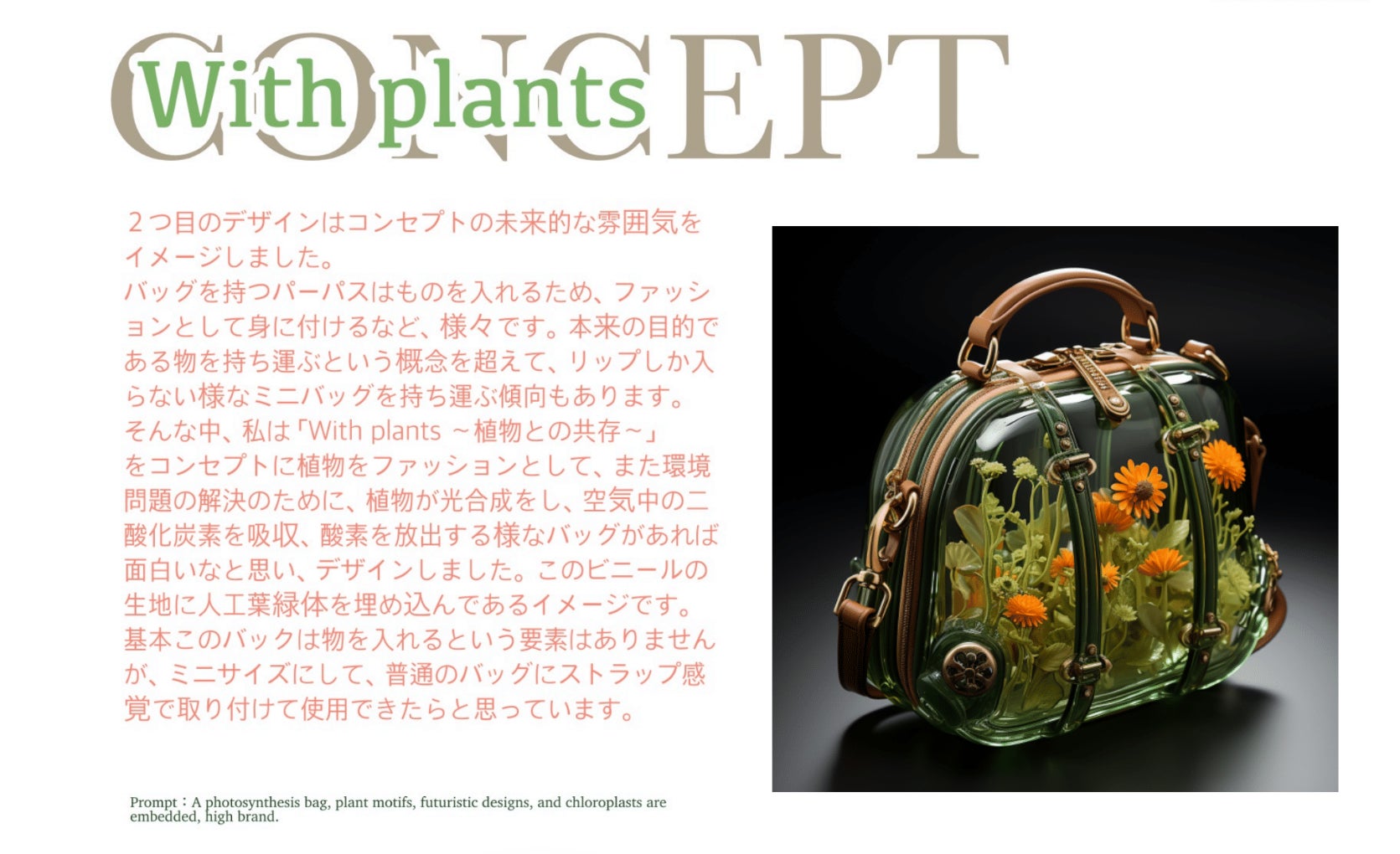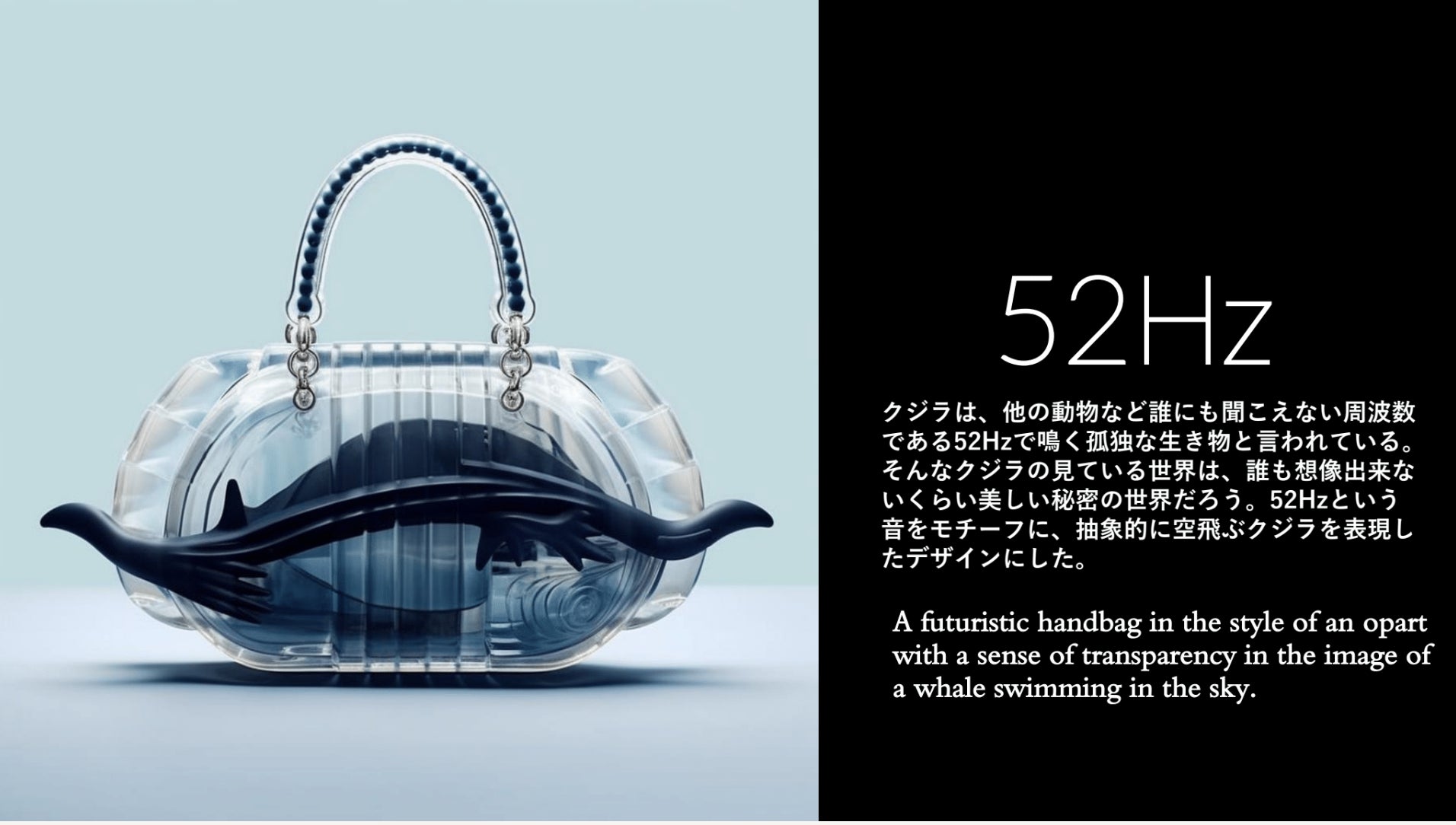 その中で1位に選ばれたのは「クジラだけが聞こえると言われている”52Hz”という音」をモチーフに、クジラと音をバッグとして表現したのが印象的だった作品が受賞。2位は「環境問題の解決のために、植物が光合成をし、空気中の二酸化炭素を吸収、酸素を放出する」と、バッグ自体が「ものを入れる」という役割を越えた作品が選ばれ、3位には「バーチャル空間では、バッグに物を入れるという機能はいらない。アクセサリーや装飾と考えて、その過程で中に金魚が入ってたら面白いのでは」と、金魚の入ったユニークな作品が選ばれました。