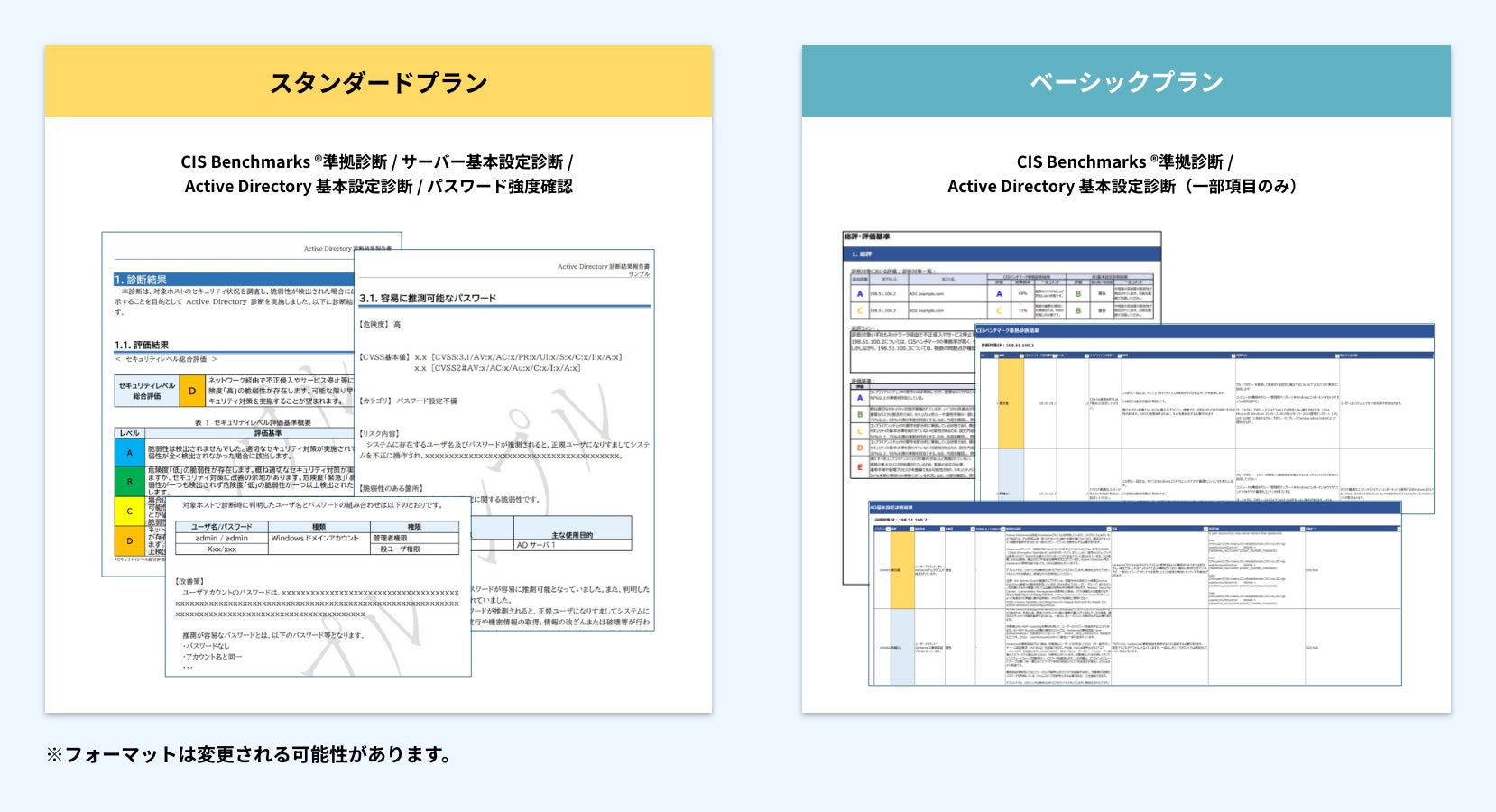 本サービスは CIS Benchmarks®※や最新のセキュリティ基準に基づき、AD がインストールされたサーバ全体を網羅的に診断する診断するプランと、ドメインコントローラーの診断のみを行うプランをご用意しています。セキュリティポリシーやアカウントまわりの基本的な設定情報の確認や、知見に基づいた独自の方法での確認を通じて、潜在的なリスクを洗い出し、AD 環境の安全性を高めるための具体的な改善案を「診断結果報告書」としてご提出します。