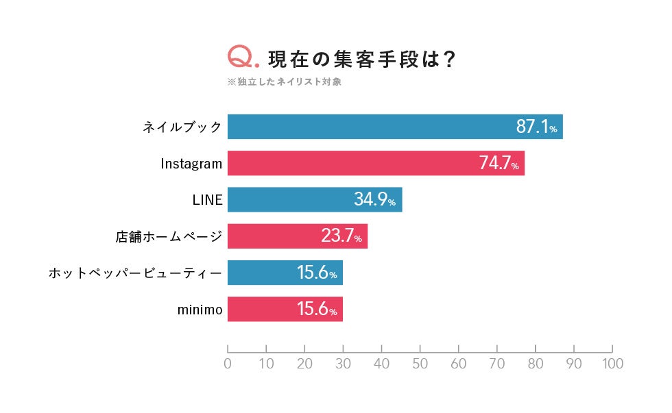 独立しているネイリストに集客方法についてきいたところ、『ネイルブック』とInstagramの利用が突出していました。