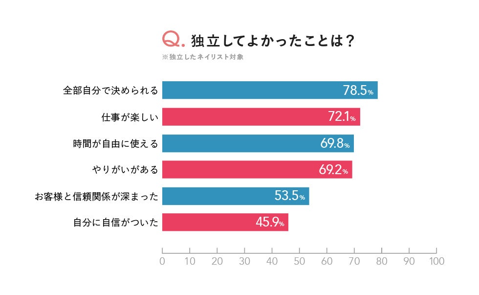 アンケート調査の結果、すでに独立しているネイリストの約99%が独立した現状に満足していると回答しました。