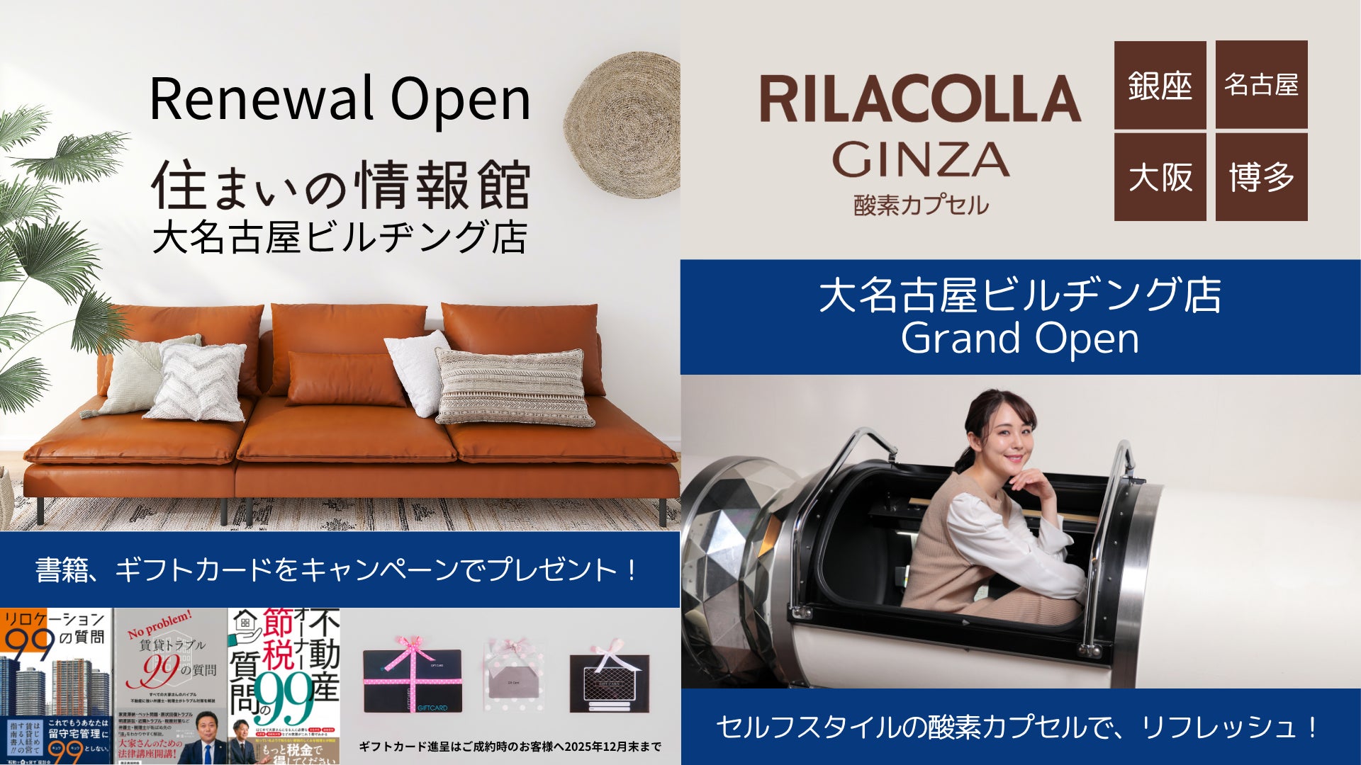 転勤・相続による住まいの運用相談から都市部での賃貸仲介まで、住まいの資産活用を支える専門店舗として、「住まいの情報館 大名古屋ビルヂング店」は地元の皆様にご愛顧いただいておりますが、リニューアルオープンに際し、これまで以上に多様なニーズに応える体制を強化いたしました。また、グループが運営する酸素カプセルサロン『銀座リラコラ』が隣接で出店しており、“働く人”のパフォーマンス向上を支える法人向けサービスの強化も進めています。
