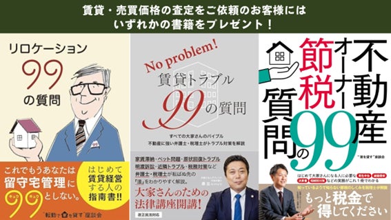 賃貸または売買成約時にギフトカードを進呈。また、査定を依頼されたお客様へ弊社プロデュースの書籍「リロケーション99の質問」「賃貸トラブル99の質問」「不動産節税99の質問」をプレゼントさせていただきます。