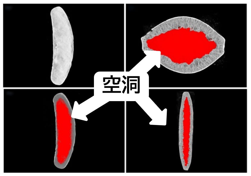 「亀田の柿の種」の大きな特徴はその形状にあります。2020年にX線CT解析を用いた調査では「亀田の柿の種」は生地の中に大きな空洞があることが明らかになりました。徹底して薄さにこだわった生地を高温で一気に焼き上げることで中がぷくっと膨らみ、空洞を生み出します。この空洞構造が、「亀田の柿の種」ならではのカリっとした軽快な食感の秘訣となっています。