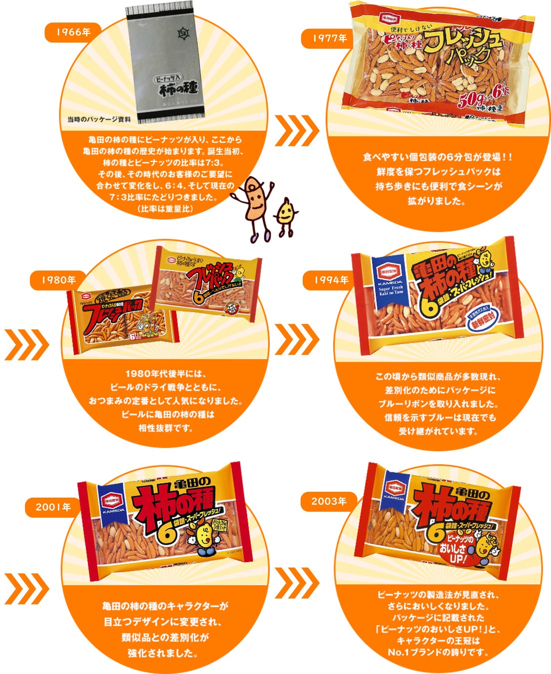 「亀田の柿の種」にピーナッツが入ったことにより、1966年からその歴史をスタートさせた「亀田の柿の種」。そこから約58年間に渡って、現在の新パッケージに至るまで時代の変化と共に様々な進化を遂げてきました。長年にわたって愛されるロングセラー商品となった「亀田の柿の種」のパッケージのこれまでの変遷をご紹介します。