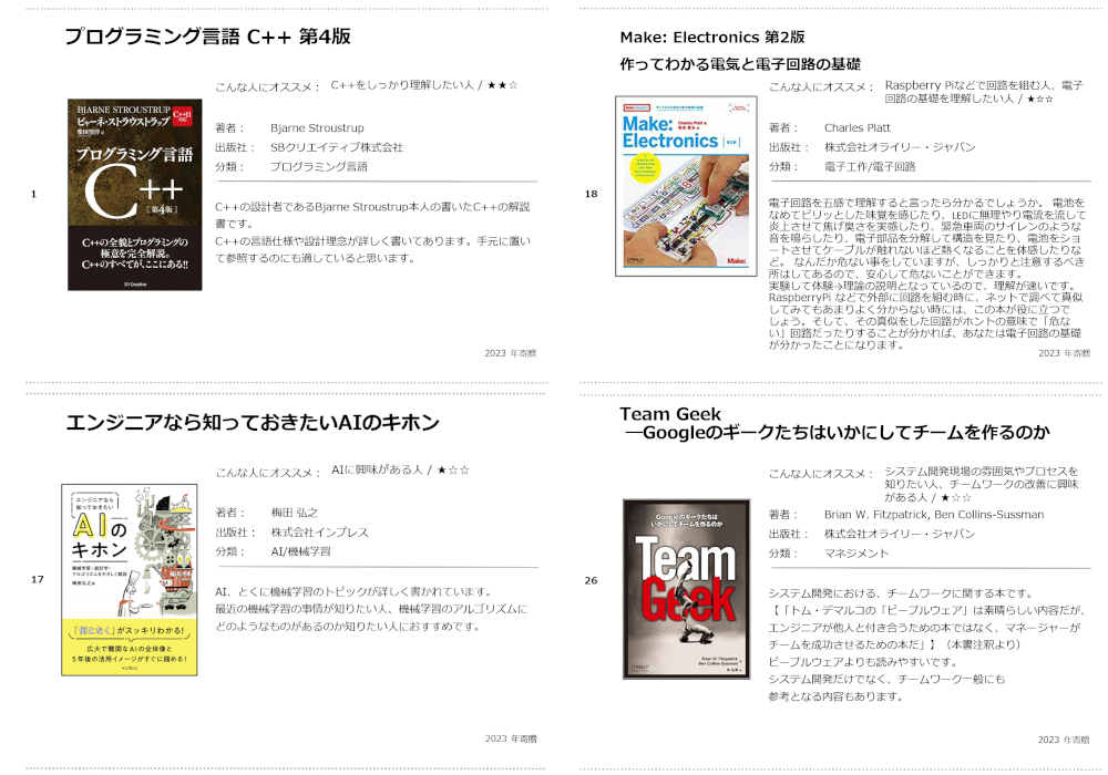 ニーズに合った図書を迷わず見つけられるよう、IT推薦図書リストも作成し、提供しています。IT推薦図書リストにはすべての寄贈図書について、概要やどんな人におすすめか、選定したメンバーによるコメントなどがまとめられています。