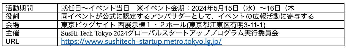 アンバサダーに就任したことを大変光栄に思います。『日本からGoogle・Facebookを100社創出する』をビジョンに掲げるアマテラスとしては、『SusHi Tech Tokyo 2024』は世界に向けて日本の素晴らしい起業家・スタートアップの存在をアピールする大きなチャンスと捉えています。スタートアップに関わる皆様へ、”まだ見ぬ出会い” に期待してぜひご参加ください!