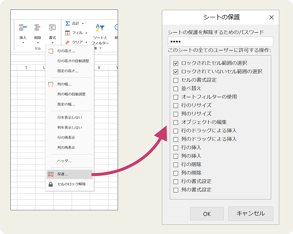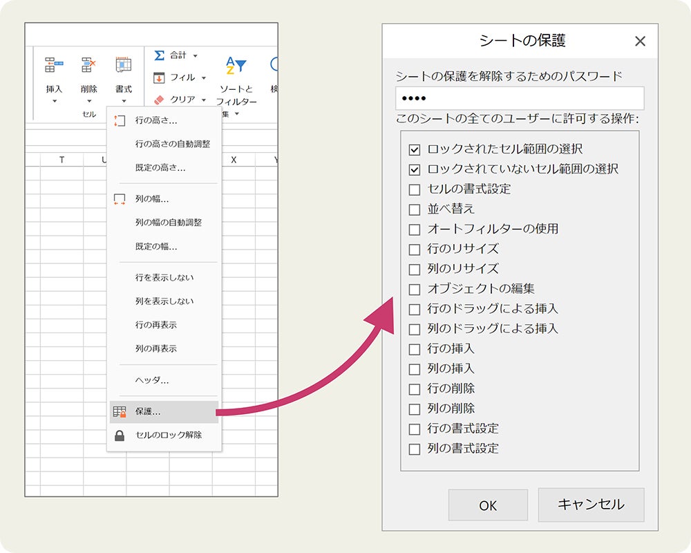 シートを保護する場合にExcelと同様にパスワードを設定できるようになりました。保護設定を行ったシート上でユーザーに制限する操作を細かく設定することも可能です。