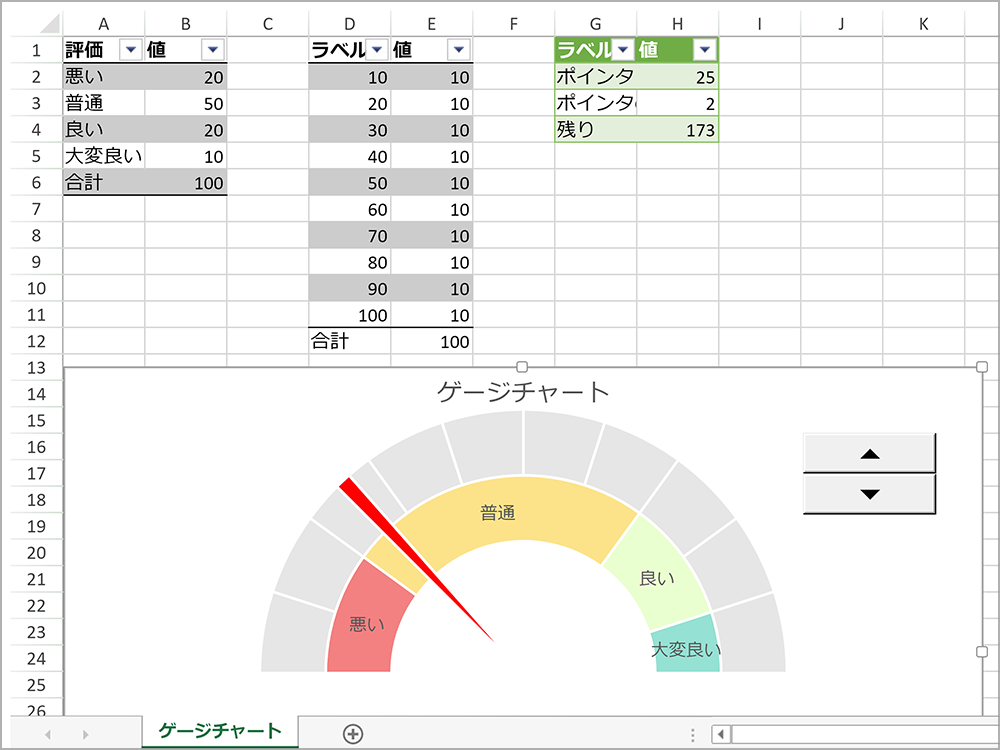 データ範囲に現在の値を量的に表現したい場合に便利な「ゲージチャート」を表示できるようになりました。Excelで作成したゲージチャートのインポートもサポートしています。