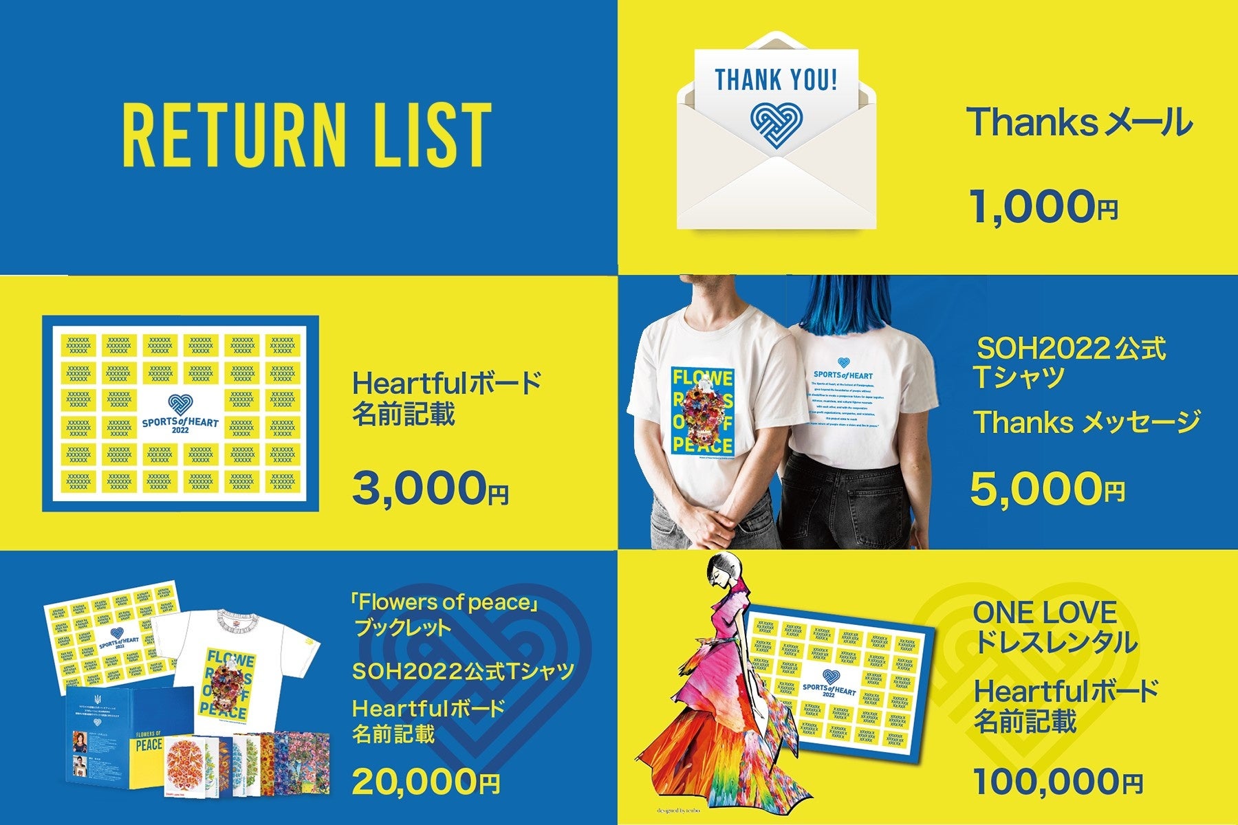 1,Thanks メール 2, Heartful ボード 名前記載 3,スポーツ・オフ・ハート 公式Tシャツ