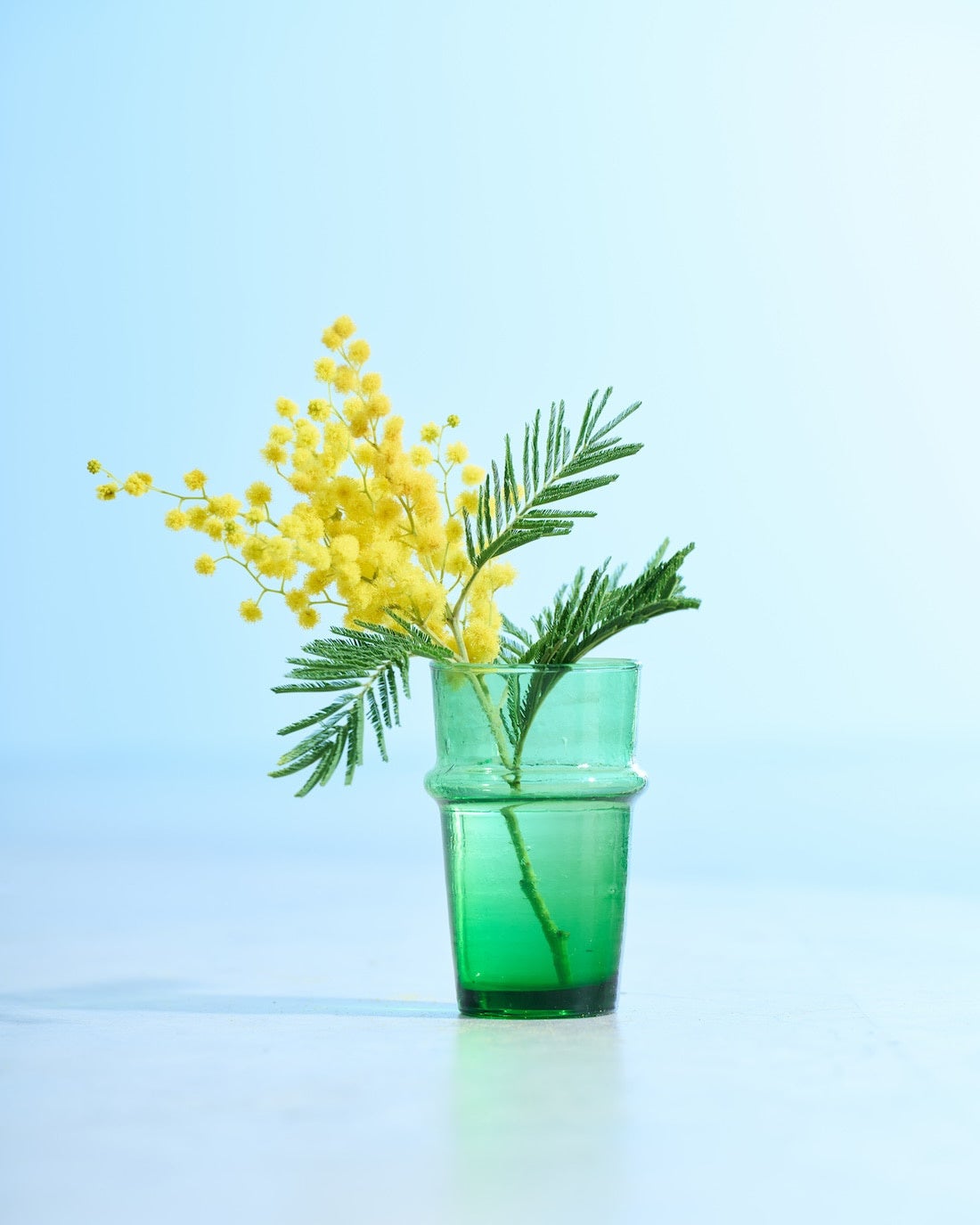 モロッコでは、ミントと砂糖をたっぷり使ったミントティーを日常的に楽しむ文化があり、その際によく用いられるのが、このグラスです。吹きガラス特有の少しいびつなフォルムが印象的で、イスラム文化において神聖とされる「緑」を基調とした、透明感ある佇まいのひと品です。