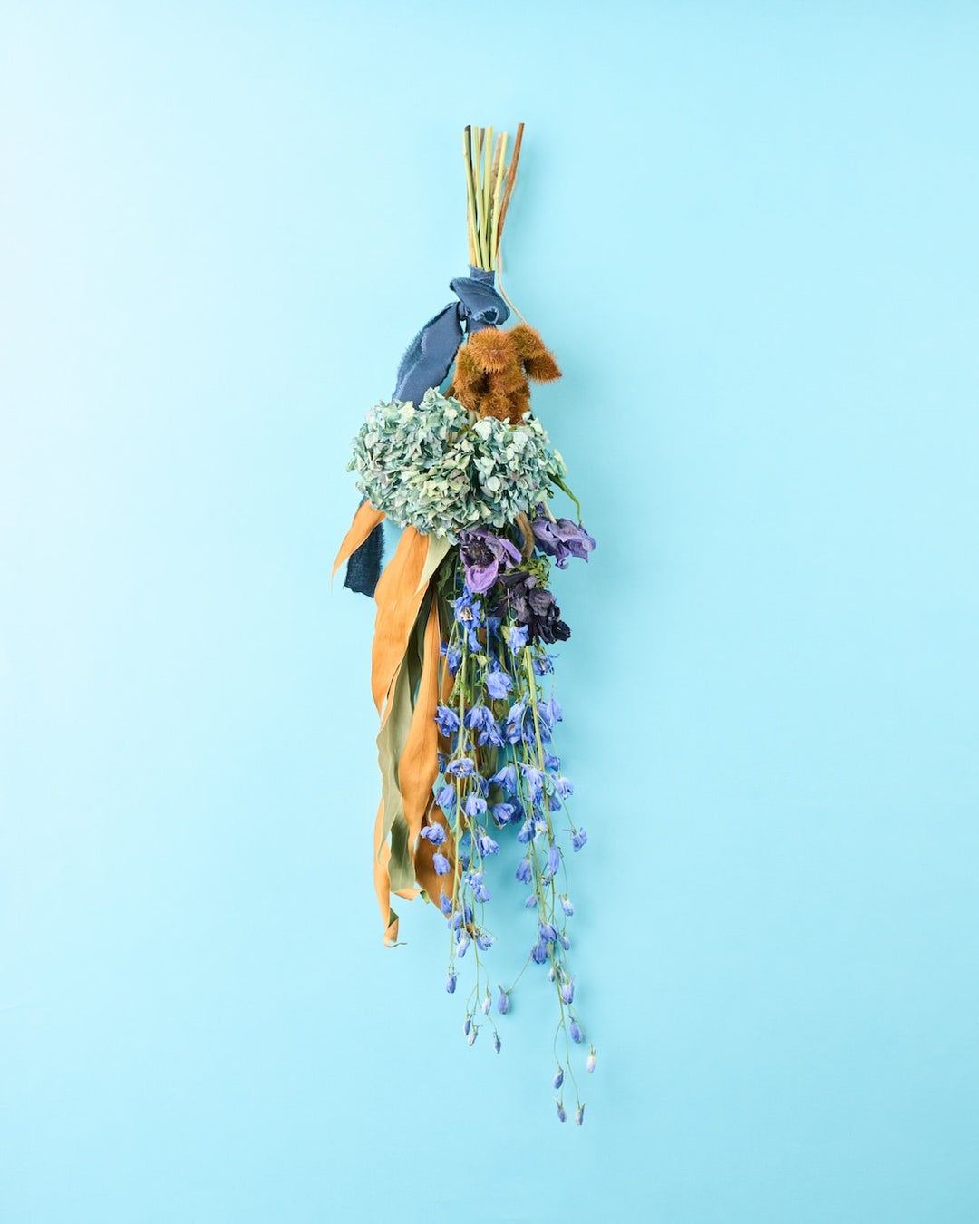ブルーとブラウンを基調としたスワッグ。「青い街」と呼ばれるシャウエンの街並みからインスピレーションを得ています。重なり合うさまざまなブルーと、青いペンキの下からところどころ覗くブラウンのコントラストを、植物の色合いと質感で表現しました。直線的なシルエットとはっきりした色づかいで、色の境目が明確に区切られた街並みのリズムも感じていただけるように仕立てています。