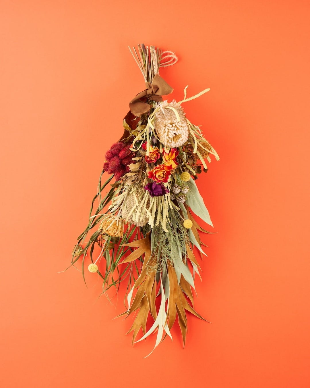 アースカラーと赤を基調としたスワッグ。大地を照らす夕日やモロッコの赤土、スーク(市場)の渾然一体とした空気感をミックスさせました。アースカラーのワイルドフラワーで、現地で感じた大地の力強さを、クラスペディアやバラなどの鮮やかな花々で、街のにぎわいをあらわしました。